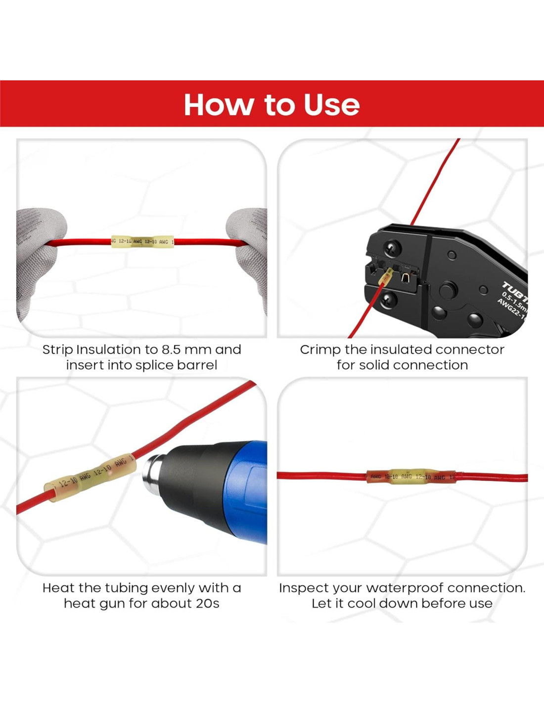 - Diseño de Tubo Translucido Impermeable: Nuestros conectores de empalme impermeables contienen pegamento termofusible de doble pared que mantiene los cables firmemente conectados y evita que se deslicen fuera de la terminación. El tubo exterior de poliolefina ofrece aislamiento y aumenta la resistencia a la tracción.