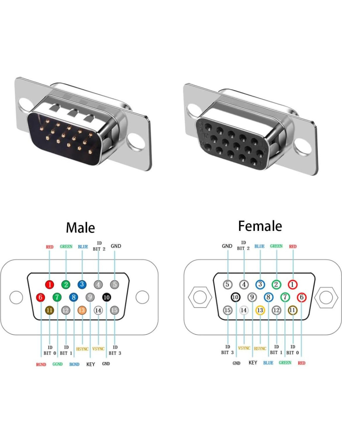 - Conector VGA hembra y macho en una placa de conexión, un extremo es conector VGA macho, el otro extremo es conector VGA hembra. Convierte una conexión VGA hembra a una conexión VGA macho, se usa para aplicaciones seriales.