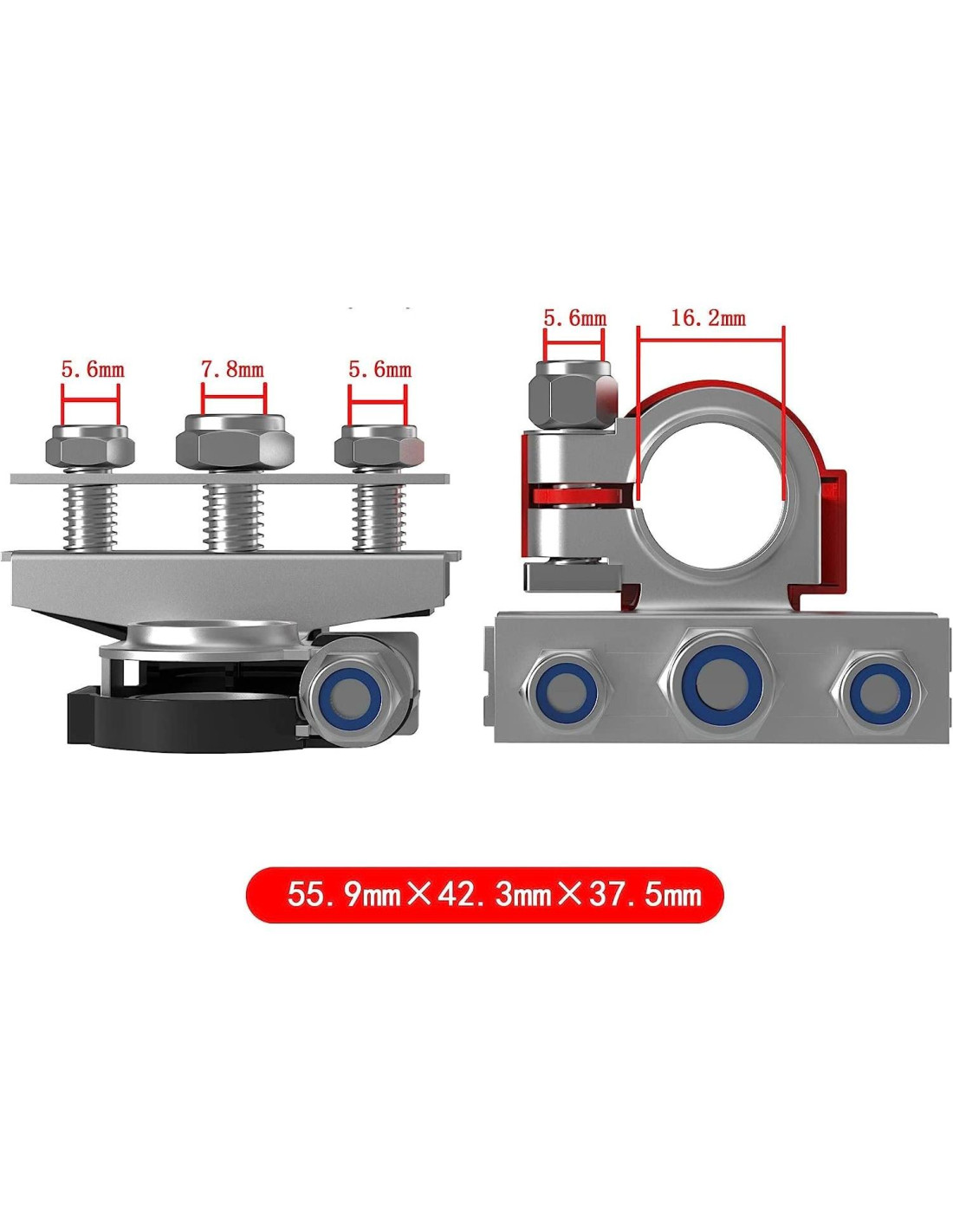 - AVISO IMPORTANTE: Antes de la instalación, asegúrese de que la batería esté en un estado desenergizado. Si el terminal original se ha deteriorado, reemplácelo inmediatamente con un nuevo terminal. Terminales de batería para coches, caravanas, vehículos recreativos, camiones, casas flotantes, motocicletas, montacargas, grúas.