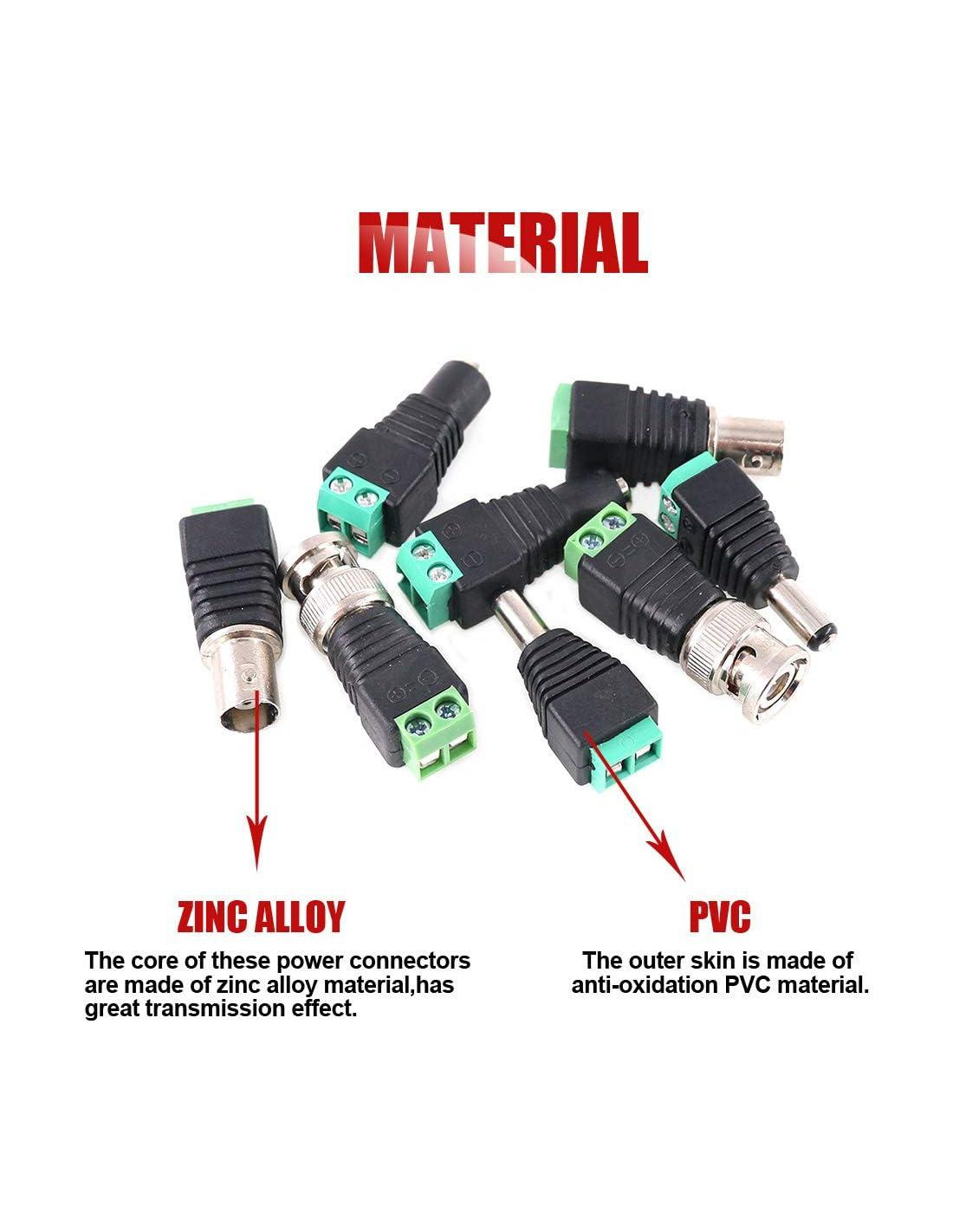 - [BUEN MATERIAL] Aleación de zinc y pines niquelados, resistentes al desgaste y a la corrosión. Buen material asegura un buen efecto de transmisión. Es una solución perfecta para aquellos que quieren hacer un cable de alimentación personalizado. Este kit de conectores de cámara CCTV proporcionará una gran conexión.