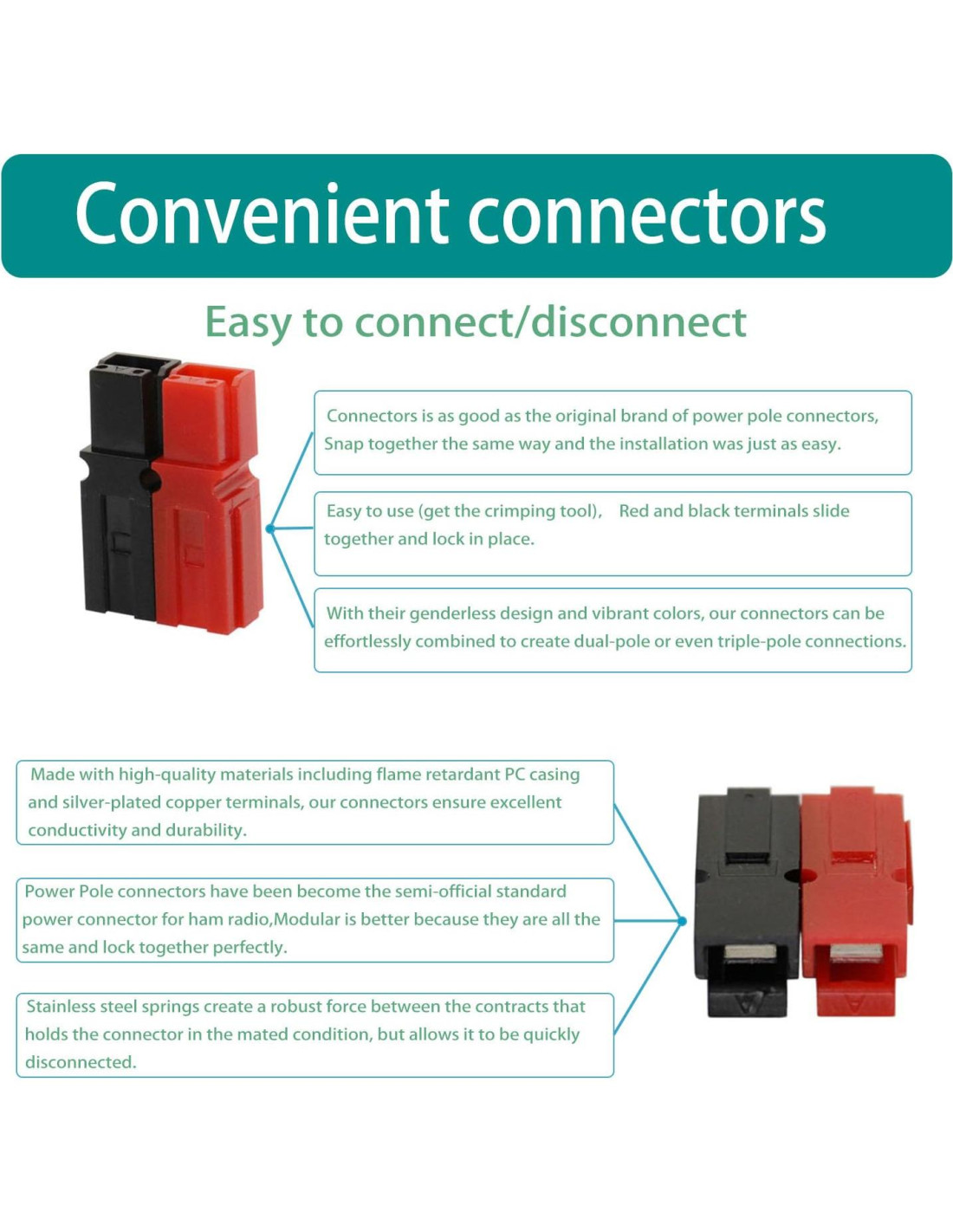 - [Múltiples Aplicaciones] Conectores de potencia de desconexión rápida para energía eléctrica, sistema fotovoltaico, los terminales de conectores son populares para autobuses eléctricos, carretillas elevadoras eléctricas, coches eléctricos, tractores, carritos de golf, coches turísticos, baterías, cortacéspedes, equipos de sonido, suministro de energía de CC regulado, EPS, suministro de energía de inversor y sistema de cargador de módulo de alta frecuencia y algunos equipos electromecánicos y otros equipos electrónicos.