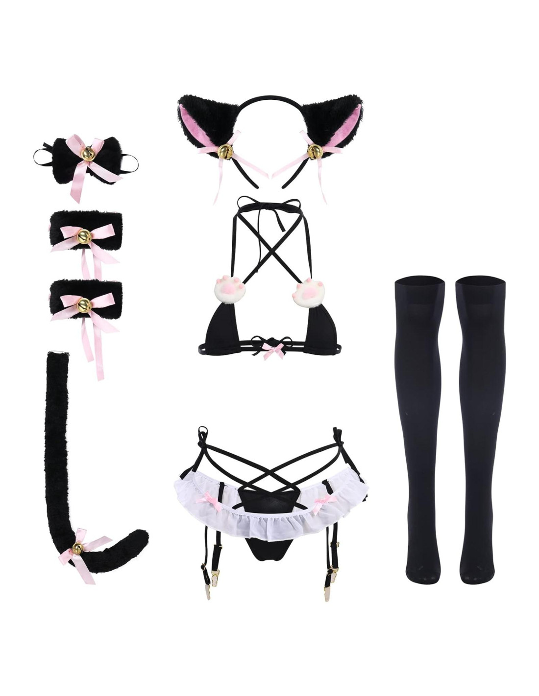- Lencería de Gato para Mujeres: Lencería de anime japonesa para mujeres, bikini extremo con llavero de gatito, bikini de bronceado micor Kawaii, sujetador y bragas lindas y accesorios, lencería Lolita japonesa, medias, diadema de orejas de gato, ropa de noche de luna de miel, aniversario, atuendo de San Valentín, conjunto de lencería cosplay.