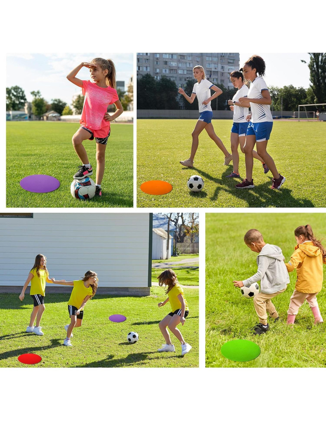 - Marcadores de Puntos de Poliéster de Alta Calidad: Este conjunto de 12 marcadores de puntos de poliéster, de tamaño 23cm/23cm/0.2cm, está hecho de silicona de primera calidad. Suaves, duraderos y resistentes a desgarros, son ideales para actividades en el patio de recreo y clases de gimnasia