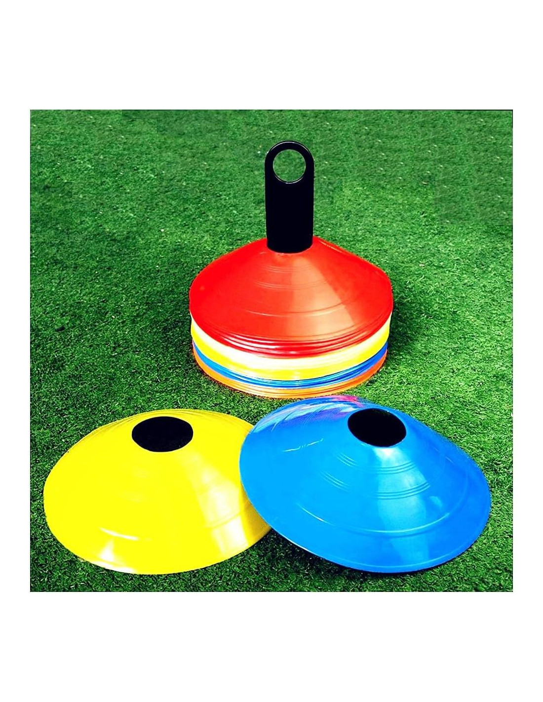- [Conos de Disco] Los conos de fútbol tienen 5.08 cm de altura x 19.81 cm de diámetro. Incluye 50 pcs de conos (5 colores: azul, naranja, amarillo, rojo y verde), 1 * bolsa de malla para transportar, 1 * soporte de plástico.