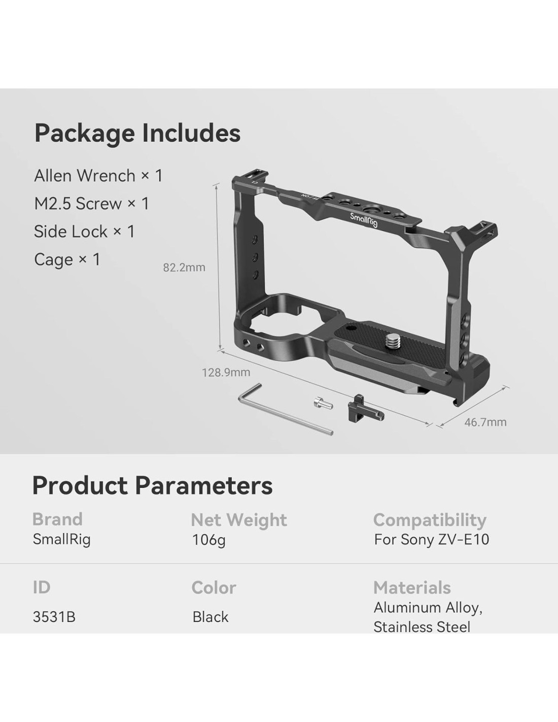 - Compatibilidad: La jaula SMALLRIG para Sony ZV-E10 3531 está diseñada para proporcionar montajes de accesorios y protección. La jaula se bloquea a través de un tornillo de 1/4"-20 en la parte inferior y además con un bloqueo anti-deflexión incluido para evitar torsiones.