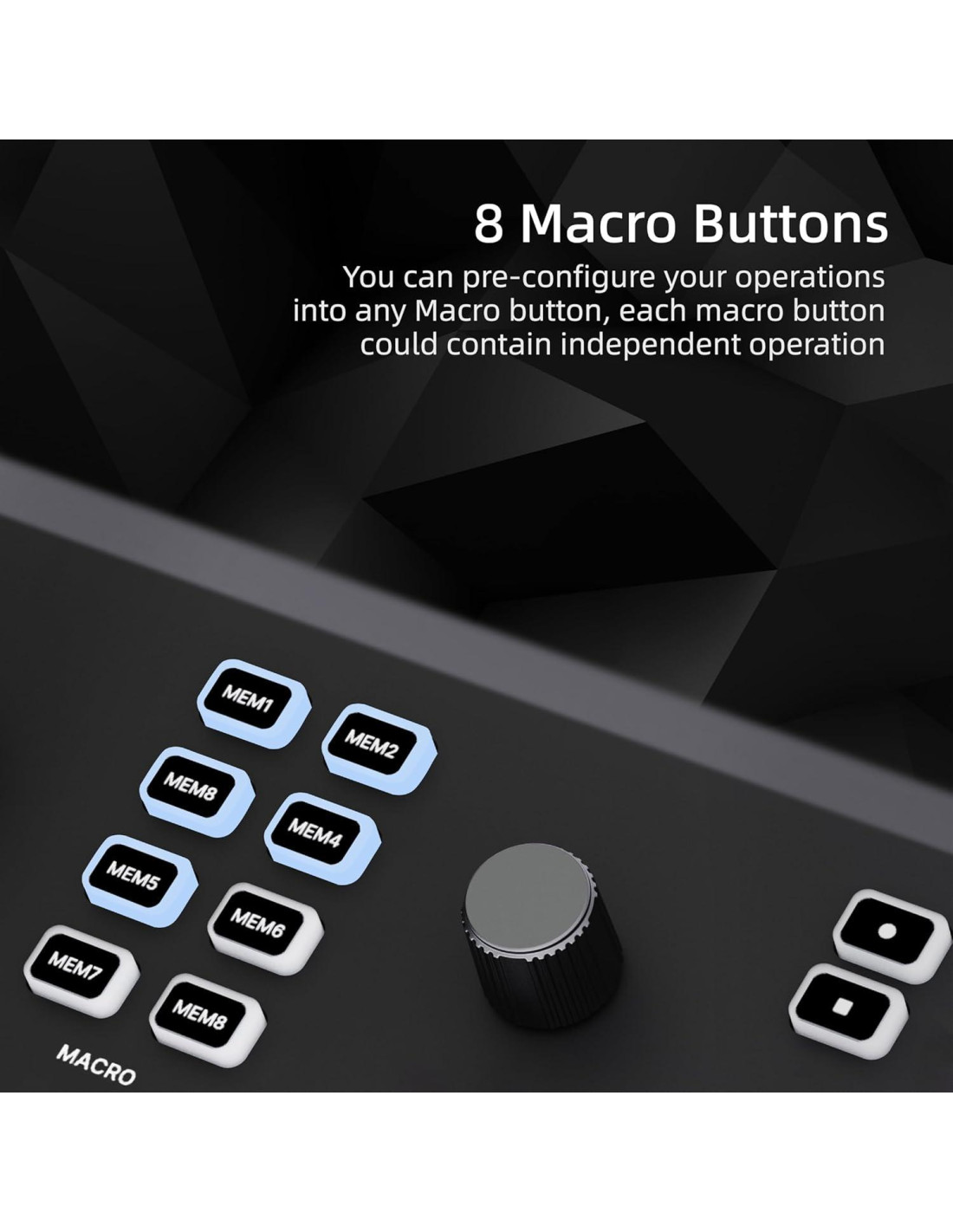- 8 Botones Macro Personalizables El GoStream Deck proporciona 8 botones Macro, a los cuales puede preconfigurar sus operaciones en cualquier botón Macro, cada botón macro podría contener una operación independiente, el macro podría ser borrado y restablecer otras operaciones.