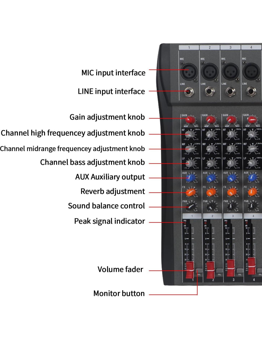 - Mezclador de Audio de 6 Canales Ultra Bajo Ruido - Este mezclador tiene 6 entradas XLR con alimentación phantom. 6 jacks de entrada de línea XLR y plugs de 1/4 de pulgada (6,35 mm). (Usa el botón +48V para alimentación phantom si los canales 1-6 están usando un micrófono de condensador de 48V). Puedes cambiar libremente entre alimentación phantom de 48V y distorsión de ruido de suministro de energía ultra baja. El canal de entrada de jack XLR soporta micrófonos de condensador de 48V, micrófonos dinámicos, voces y otros instrumentos, mientras que el canal de entrada de plug no balanceado de 1/4 de pulgada soporta micrófonos/guitarras eléctricas/cajas DI, etc. y instrumentos musicales.