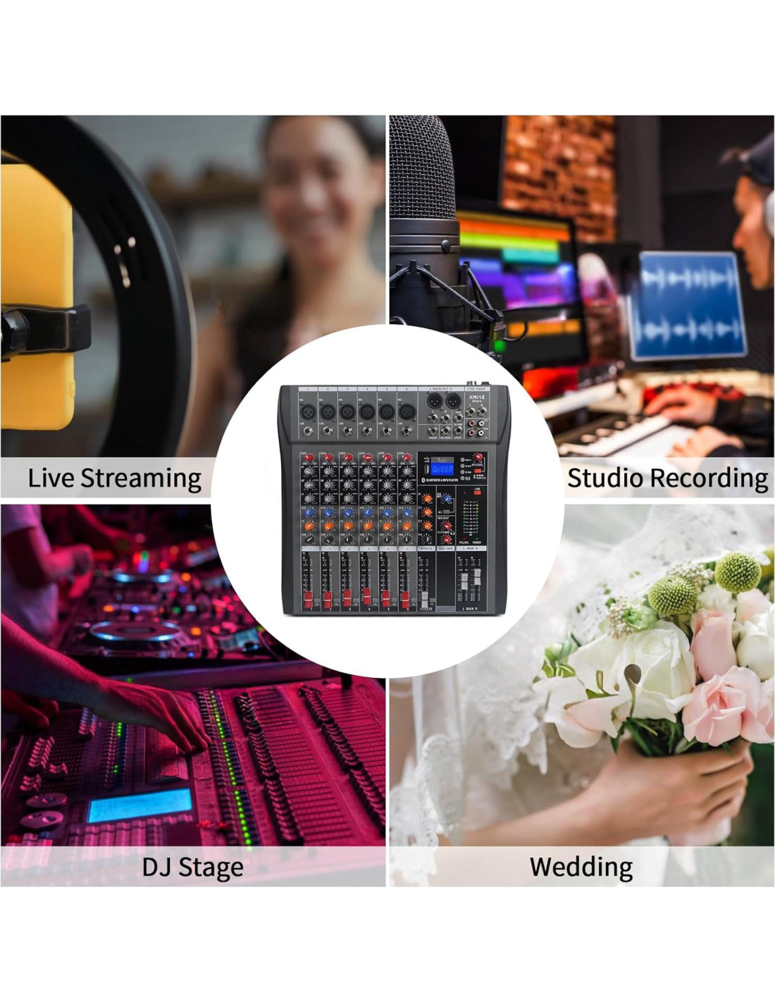 Soporta conectores XLR y plug no balanceado de 1/4" (+48V botones phantom). La mesa de sonido tiene ocho canales de entrada separados, cada uno con su propio control de ganancia, ajustes de agudos, medios y graves, y efectos separados. Esto te permite mezclar fácilmente múltiples fuentes de audio y ajustar el volumen y el timbre de cada canal según sea necesario. El mezclador de 6 canales te ayuda a crear grandes efectos de sonido, haciendo que tu música y grabaciones de sonido sean más expresivas y claras. Realmente adecuado para Aplicaciones de Estudio Profesional y Actuaciones en Escenario.