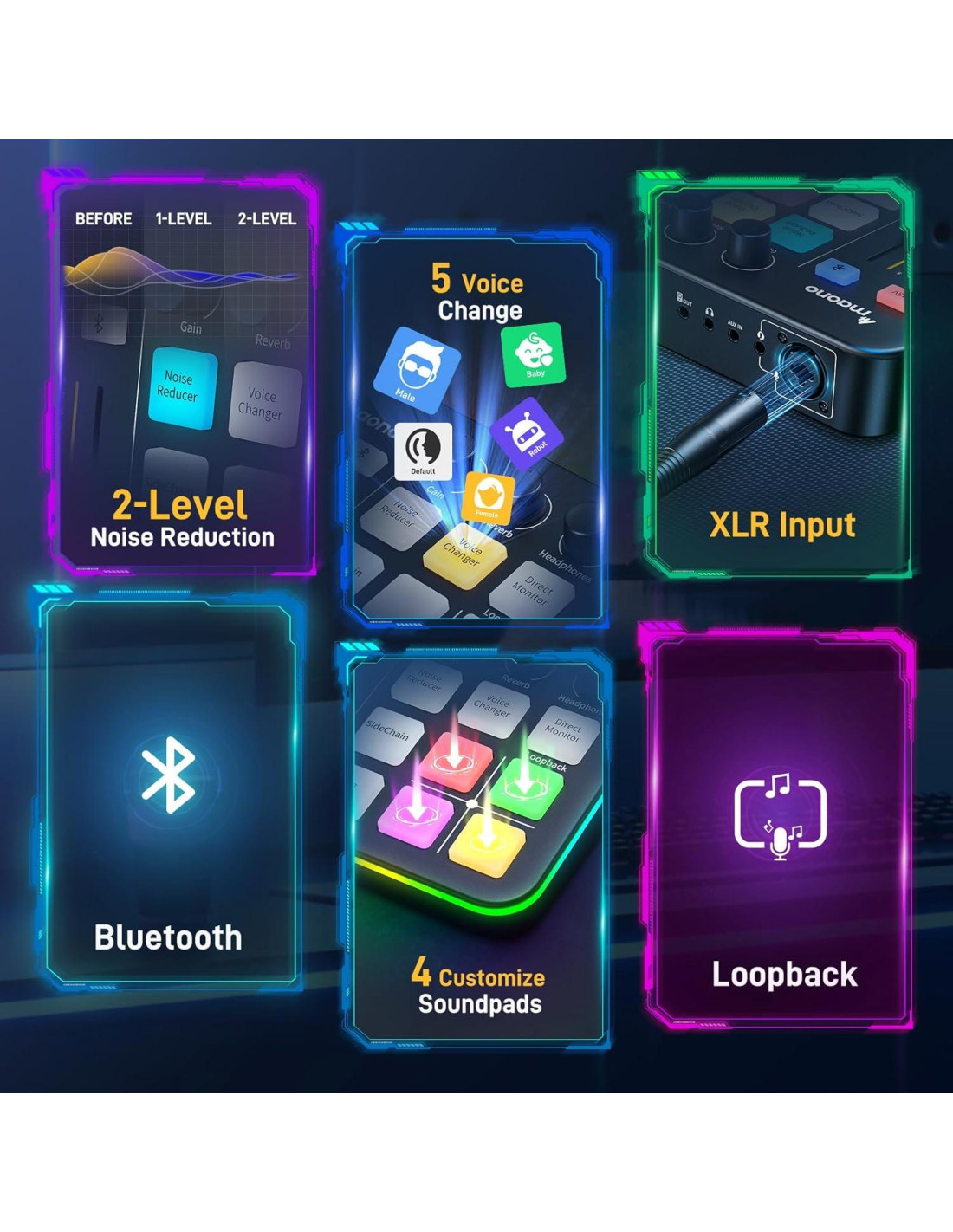 - Mejora Tu Voz: Incorpora Pro-preamp y 48V phantom power para liberar todo el potencial de tu micrófono XLR, permitiéndote lograr rápida y fácilmente el audio de alta calidad típicamente asociado con configuraciones de streaming. La perfecta coordinación de ganancia y volumen puede permitir que tus compañeros escuchen un sonido suficientemente alto. La reducción de ruido con un solo clic asegura audio claro para tus compañeros, ya sea al planear estrategias con ellos o al interactuar con los espectadores durante las transmisiones en vivo.