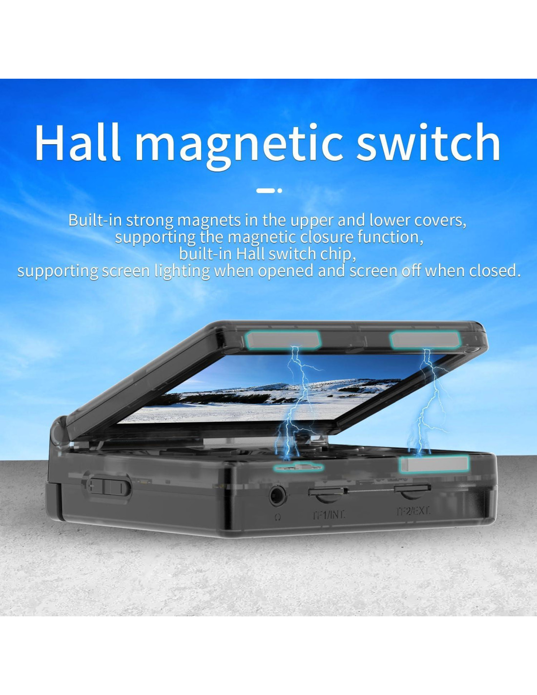 - [Consola de Juegos Portátil Anbernic RG35XXSP] La RG35XXSP flip es pequeña y tiene un diseño de cuerpo tipo concha, con imanes fuertes incorporados en las cubiertas superior e inferior, que admiten la función de cierre magnético. La consola de juegos retro tiene un chip de interruptor Hall incorporado, que admite la iluminación de la pantalla al abrirse y la pantalla apagada al cerrarse.