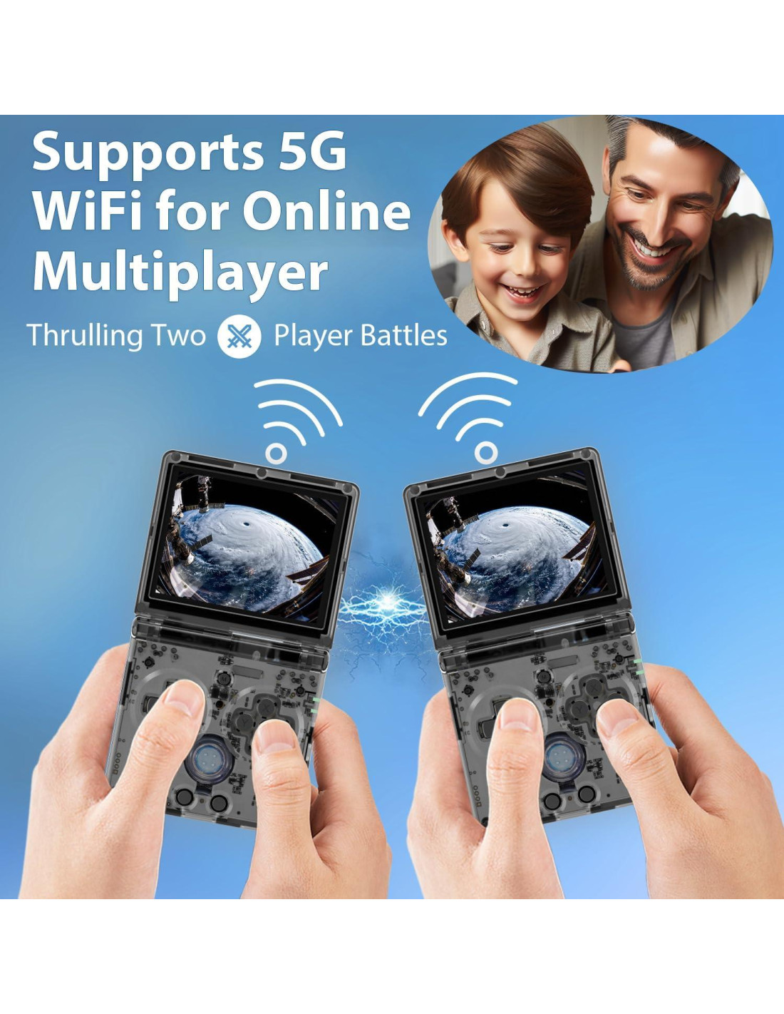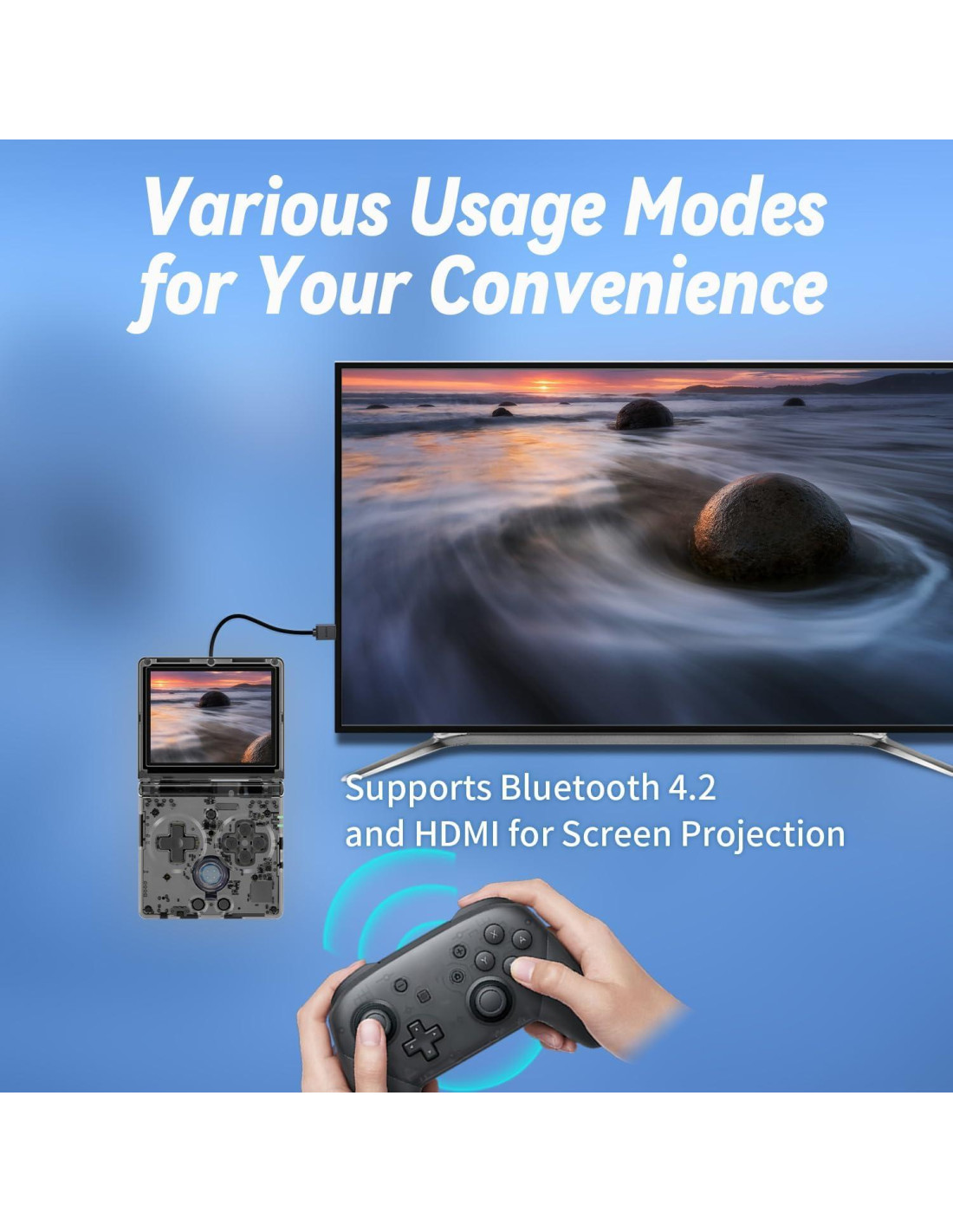 - [WiFi 5G & Bluetooth 4.2 & Salida HD TV] La RG35XX SP flip tiene una tarjeta TF de 64G incorporada. La consola de juegos portátil es compatible con controladores inalámbricos de 2.4G y controladores por cable. También puedes conectarte a la TV y transferir el juego a la TV para una mejor experiencia de juego.