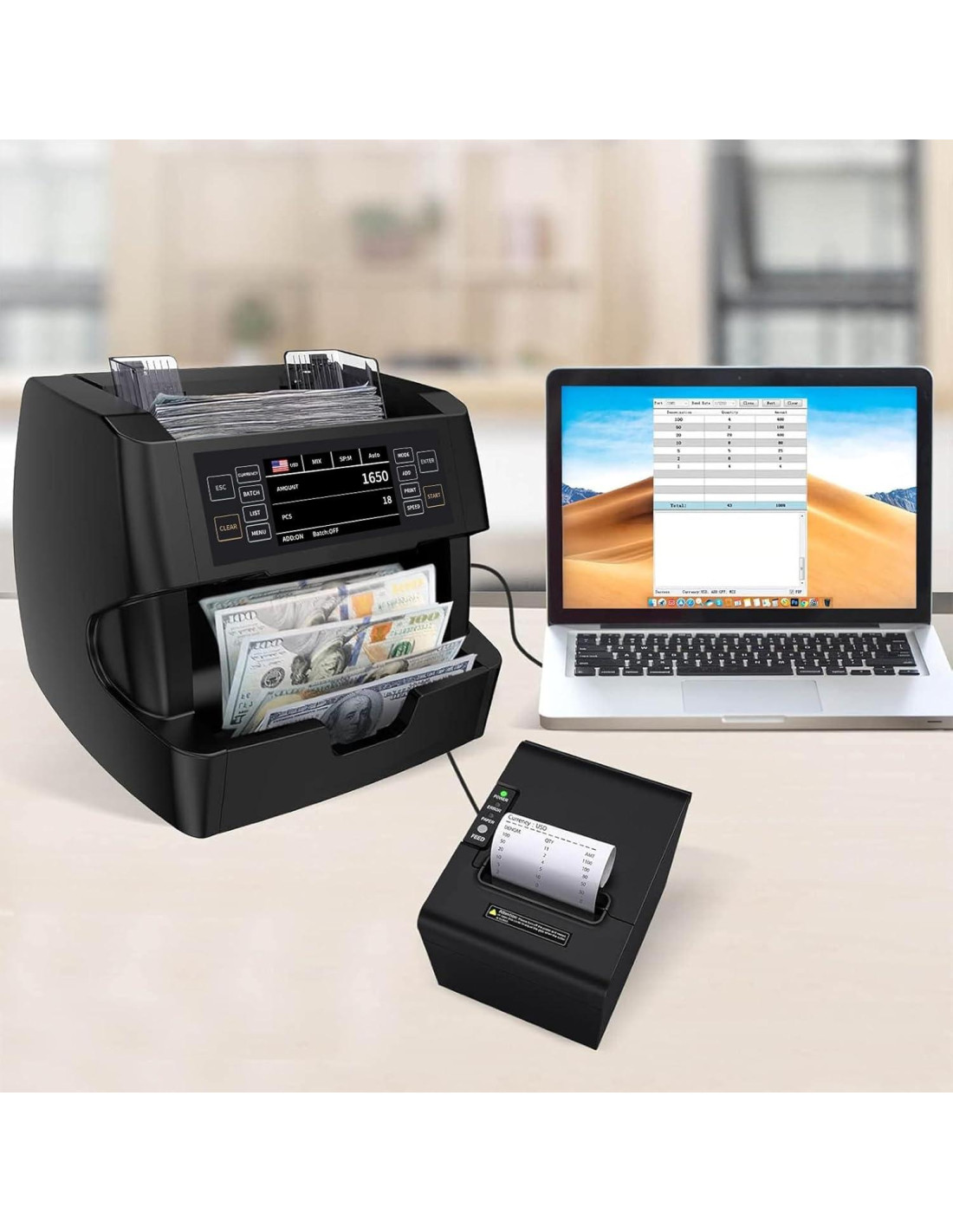 - Operación Suave y Confiable - La rueda de recepción de dinero mejorada asegura que los billetes no vuelen ni se atasquen al contarse. Nuestro innovador diseño de apilador antiestático hace que el conteo de billetes sea mucho más suave. Se autodiagnostica al inicio utilizando sensores integrados para detectar instantáneamente problemas. Esto viene con una generosa protección de calidad de dos años con actualización de software para el lanzamiento de nuevos billetes/nueva moneda/desarrollo de nueva moneda en el software original.