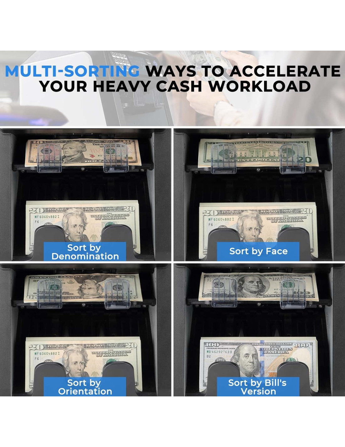 - [No solo contar, también clasificar] La máquina contadora de dinero MUNBYN IMC08 cuenta billetes de denominaciones mixtas y reporta el valor total y desglose. Con un diseño de 2 pockets, también puede clasificar los billetes por Denominación/Frente/Orientación/Moneda/Versión. Mejora enormemente tu eficiencia en el manejo de efectivo. Además, no hay información sobre la máquina contadora de efectivo en la caja exterior, asegurando la seguridad de tu privacidad e información.