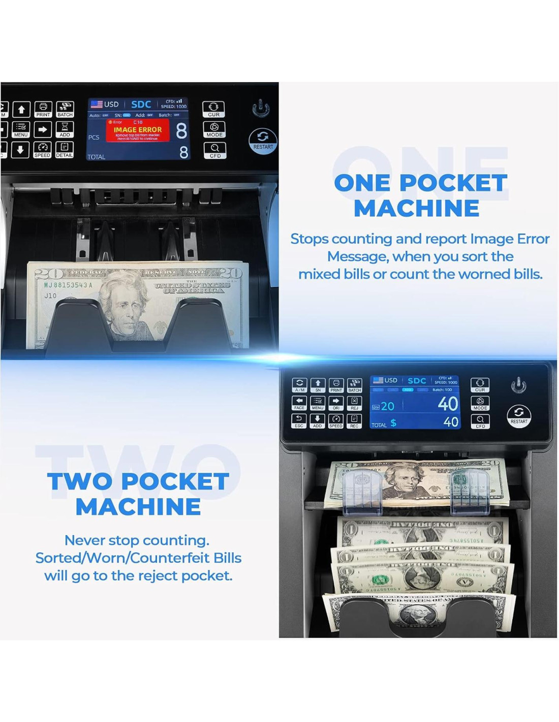 - [Diseño de 2 Pocket] Un contador de billetes de un pocket se detendrá y reportará un CÓDIGO DE ERROR al clasificar billetes o encontrar billetes falsificados/deteriorados. Pero la máquina de dos pockets puede clasificar billetes y eliminar billetes deteriorados o falsificados sin detenerse y mostrar un CÓDIGO DE ERROR. El conteo y clasificación de valores mixtos al final del día nunca ha sido más fluido y eficiente.