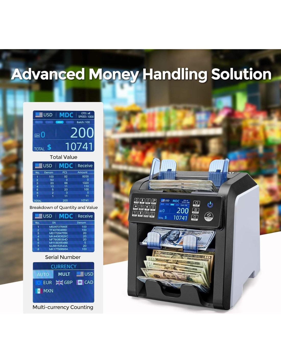 - [12 Métodos de Detección de Falsificaciones] La máquina contadora de dinero de denominación mixta asegura la autenticidad de tus billetes (efectiva contra Superdollar) con 2CIS, UV, IR, MT, MG, Dimensional y Grosor, Tinta Variable de Línea de Seguridad, Espectro, Fluorescencia, Detección de Reconocimiento de Número de Serie. Ya no tendrás que preocuparte por recibir billetes falsificados, ya que tu detección es incluso más precisa que la de los bancos.