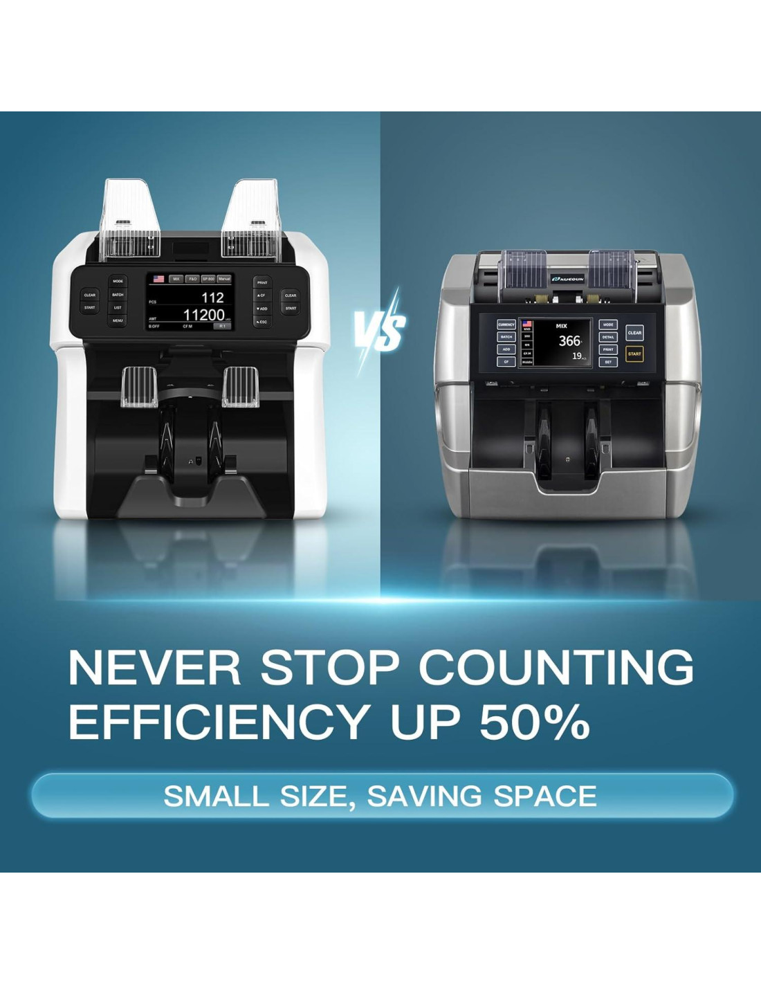 - Diseño Revolucionario: El clasificador de dinero de dos bolsillos más compacto del mercado, el pasaje se puede abrir completamente desde el frente (presione el botón debajo del panel), fácil de limpiar diariamente y eliminar objetos extraños. Ocupa un poco más de espacio que un contador de billetes normal, ahorrando espacio de trabajo.