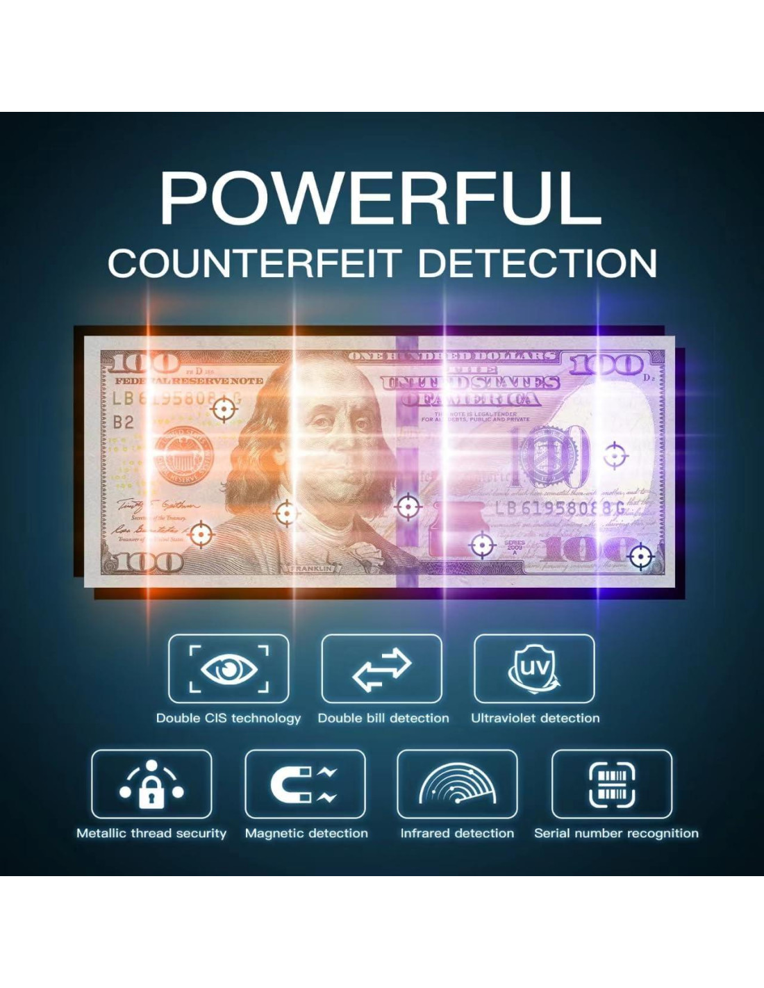 - Innovación Constructiva en Detección de Falsificaciones: El creador aplica tecnología Blink CIS en el reconocimiento de billetes y el área de detección de falsificaciones, detecta el billete bajo luz infrarroja de doble frecuencia de 850 mm y 940 mm. Efectivo y confiable para atrapar dólares falsos. Además de un par de CIS, el clasificador de dinero también tiene UV, MG, IR, MT, Tinta Variable de Línea de Seguridad, Reconocimiento de Número de Serie para USD, EUR, GBP, CAD, MXN.