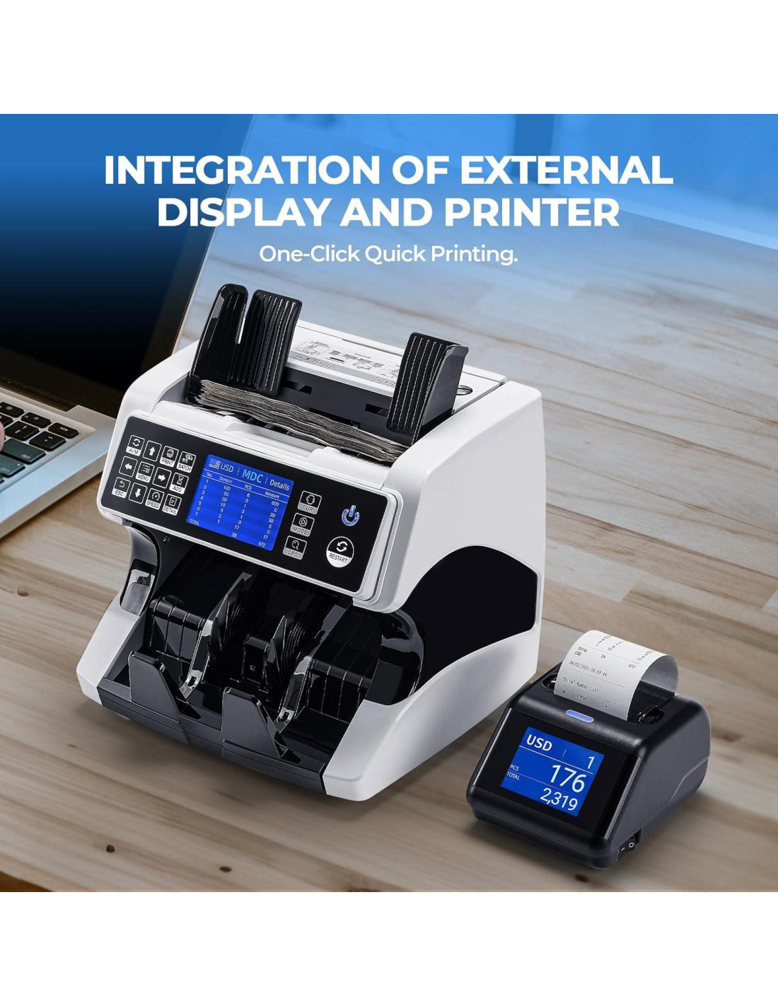 - Actualizar pantalla externa: Equipado con una nueva pantalla externa que combina visualización e impresión. Fácil de mantener un registro del valor total y la cantidad de conteo, desglose del conteo por denominación y número de serie de los billetes. Adopta tecnología de impresión térmica, la impresora que asegura calidad de impresión clara y velocidad de impresión rápida.