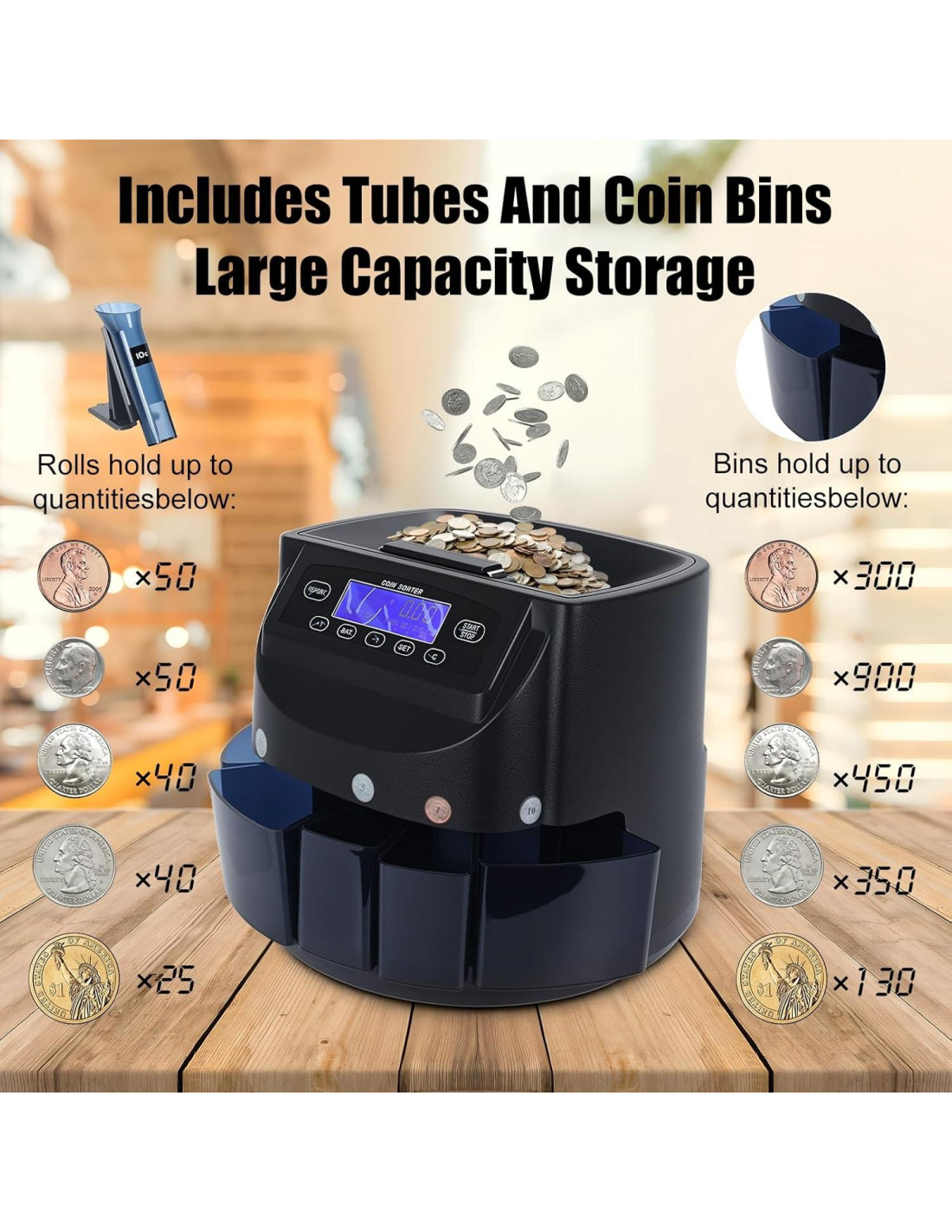 - Fácil Operación: Midiendo 26cm*19cm*26cm, la máquina de monedas proporciona una experiencia de conteo de monedas motorizada sin esfuerzo y precisa. Simplemente vierte tus monedas en la tolva de la máquina contadora de cambio. Luego presiona INICIAR, contará y clasificará automáticamente tus monedas. La pantalla LCD de la máquina clasificadora de monedas muestra el valor total y la cantidad de diferentes monedas. No más tener que sumar manualmente cada denominación.