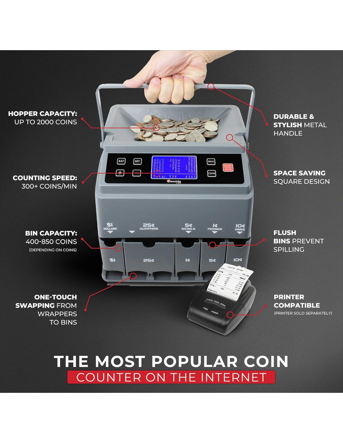 - Rápido, Confiable y Preciso: Con una capacidad de tolva de 2000 monedas, el C300 contará y clasificará sus monedas con precisión a una velocidad de 300 monedas por minuto.