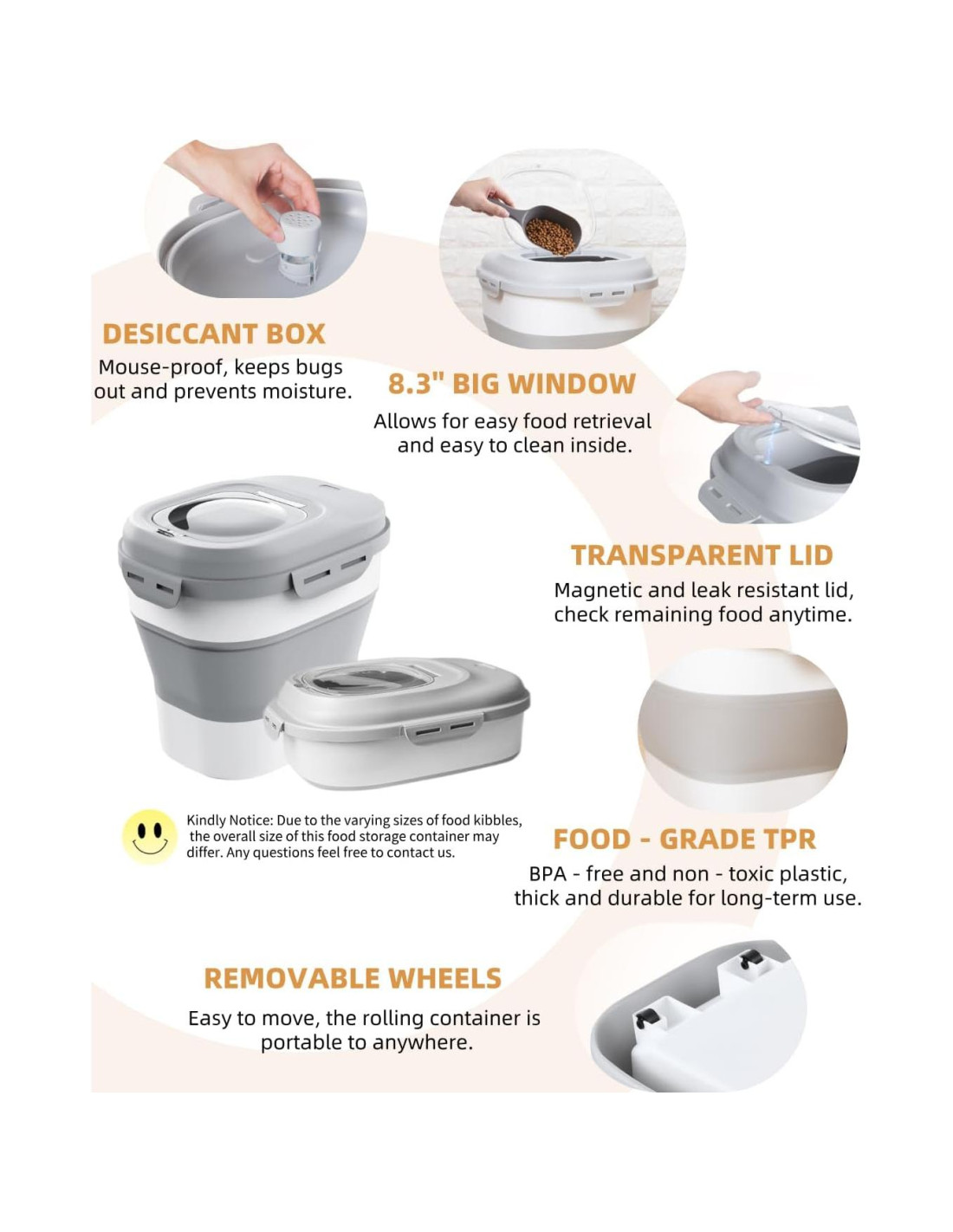 Ruedas removibles para un movimiento suave + Tapa de vista clara para ver cuánto alimento queda + Dos aberturas: Boca de cucharón ancha + puerta de vertido rápido.