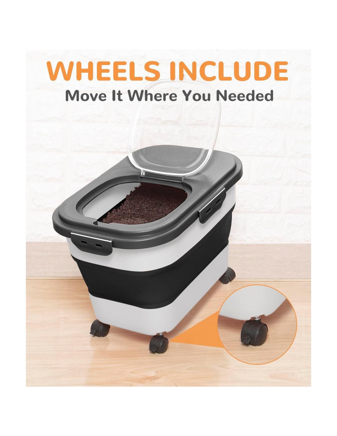 - RUEDAS DESMONTABLES INCORPORADAS: ¿Cansado de cargar bolsas pesadas de comida para mascotas? Nuestro contenedor de comida para perros está diseñado cuidadosamente con 4 ruedas rodantes desmontables, lo que facilita moverlo de un lugar a otro. Ya sea que lo estés trasladando a otra habitación o llevándolo al aire libre para un picnic con tus mascotas, las ruedas que ruedan suavemente aseguran una experiencia sin complicaciones.