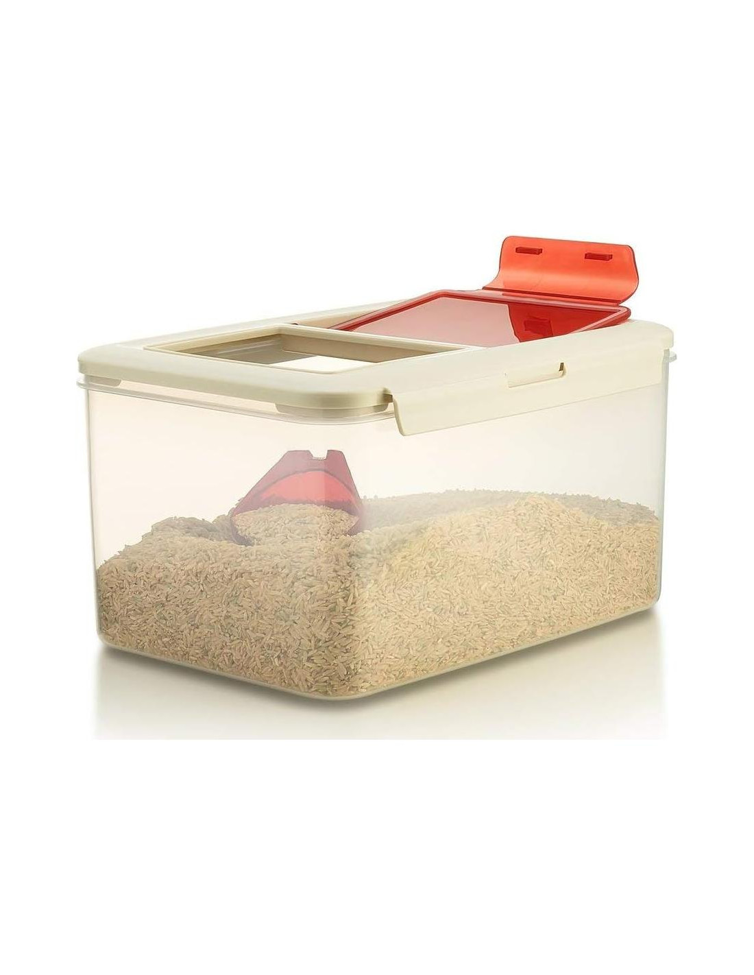 - Contenedor de Almacenamiento Grande: Este contenedor dispensador de arroz de 20 lb (9,07 kg) viene con una taza medidora (180 ml) y es ideal para almacenar alimentos secos como azúcar, arroz y harina, o para ser utilizado como un contenedor de alimentos para mascotas. Estos grandes contenedores de almacenamiento con tapa son duraderos y apilables para una despensa o armario organizado y sin desorden.