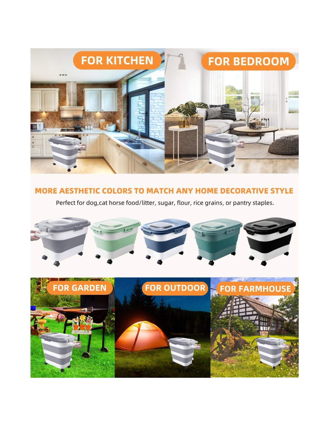 Revolucionario para hogares organizados. Diseñado con gran capacidad de almacenamiento, es perfecto para: comida para perros, comida para gatos/arena, azúcar, harina, granos de arroz, o productos básicos de despensa.