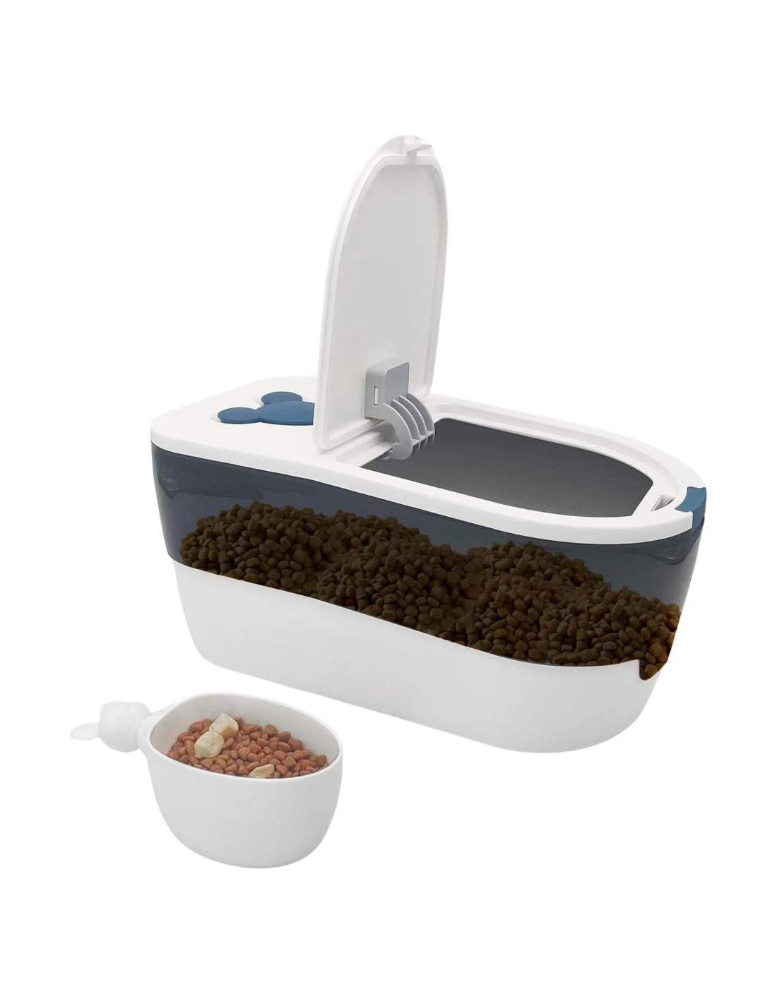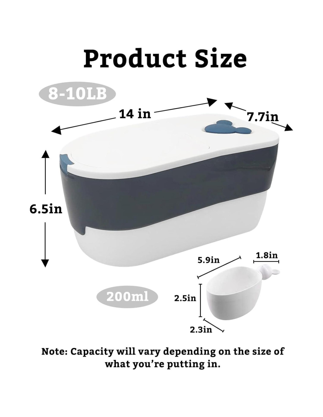 - Tamaño de almacenamiento: El contenedor de comida seca para gatos de 3.2 kg mide 35.6 cm x 19.6 cm x 16.5 cm. Puede almacenar alrededor de 3.2-4.5 kg de comida. La capacidad variará dependiendo del tamaño de lo que estés poniendo, la capacidad del producto es solo para referencia