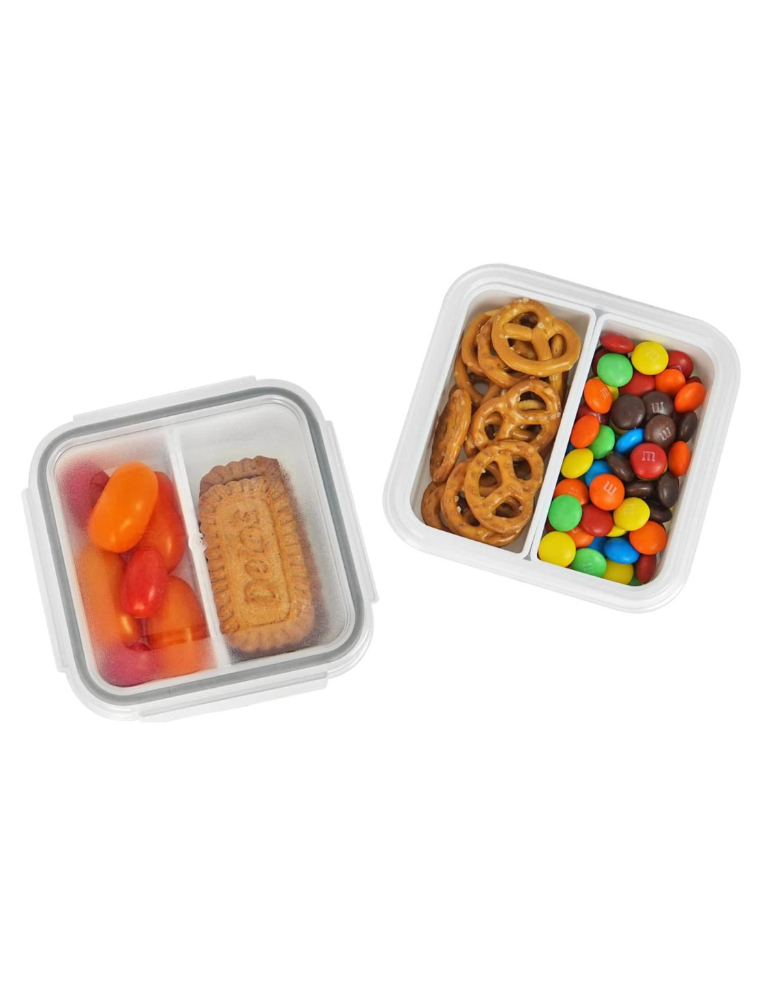 Crea tu propia combinación de snacks, frutas, palitos de verduras, salsas y más. Disfruta de más de un snack. 2 Snacks en un contenedor! Saca solo uno si solo deseas un snack. 2 medias tazas a la vez! Útil para el control de porciones.