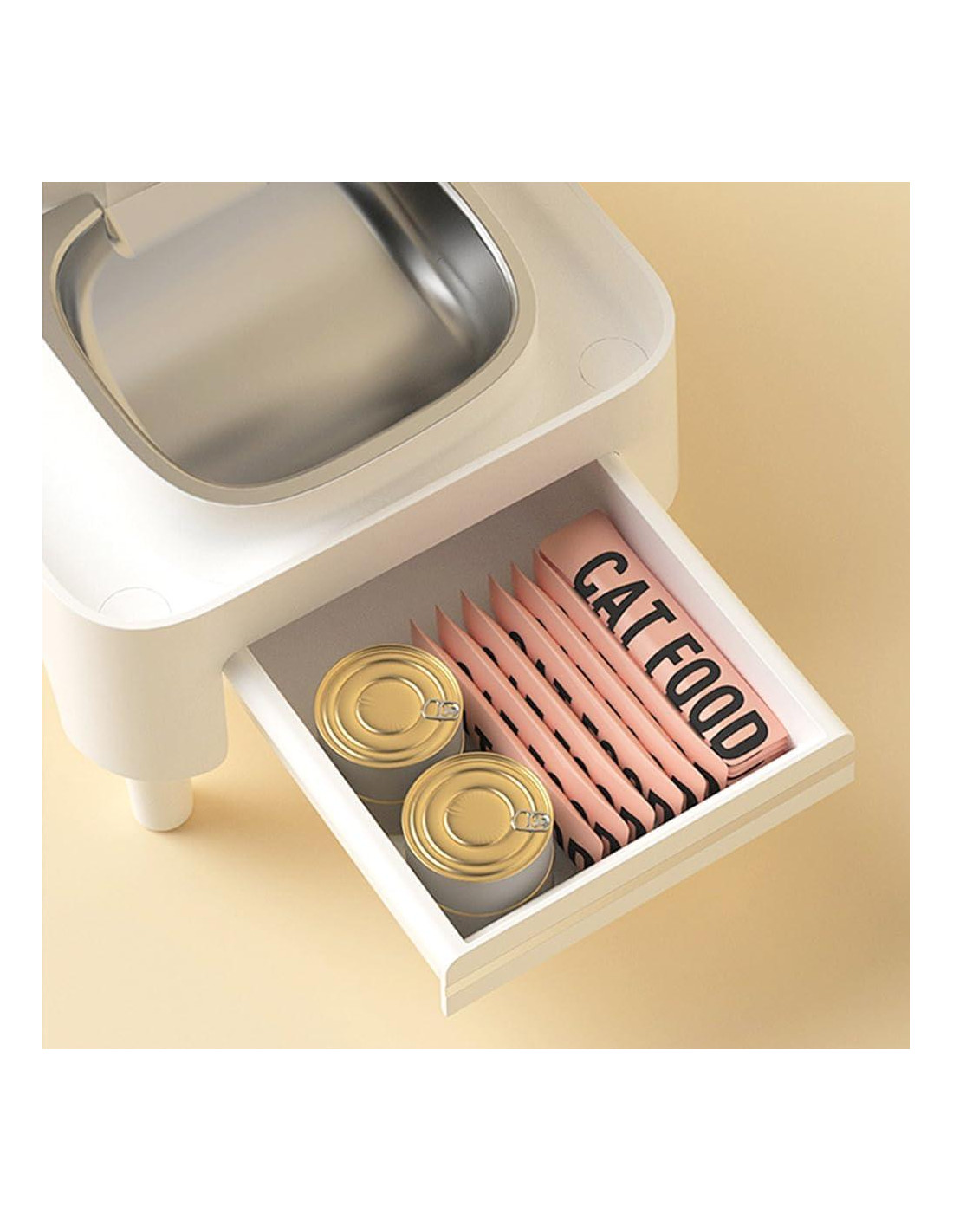 - [Mesa de Alimentación para Gatos con Cajón] El soporte para alimentador tiene un cajón incorporado y un diseño práctico, lo que facilita el almacenamiento de snacks para mascotas, galletas, latas, etc. Proporciona espacio de almacenamiento adicional y mantiene la mesa ordenada.