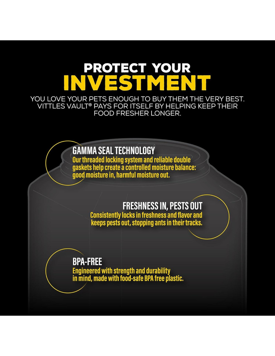 - Di adiós a las plagas molestas: además de mantener la frescura y el sabor, la tecnología de sello GAMMA mantiene fuera a las plagas, deteniendo hormigas y otros insectos fuera de este contenedor de almacenamiento de comida para gatos o perros. Perfecto para comida seca para mascotas