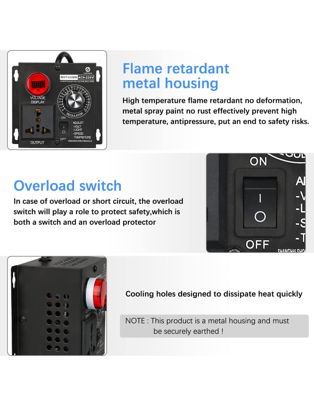 - Funciones Poderosas Compatible con entrada de energía de 120V/220V, la corriente máxima es de 15A, el voltaje de salida es ajustable de 0-220V, y la potencia límite es de 400W. 4000W es la potencia máxima cuando trabaja bajo una carga resistiva, y la carga inductiva es 1/3 de la carga resistiva.