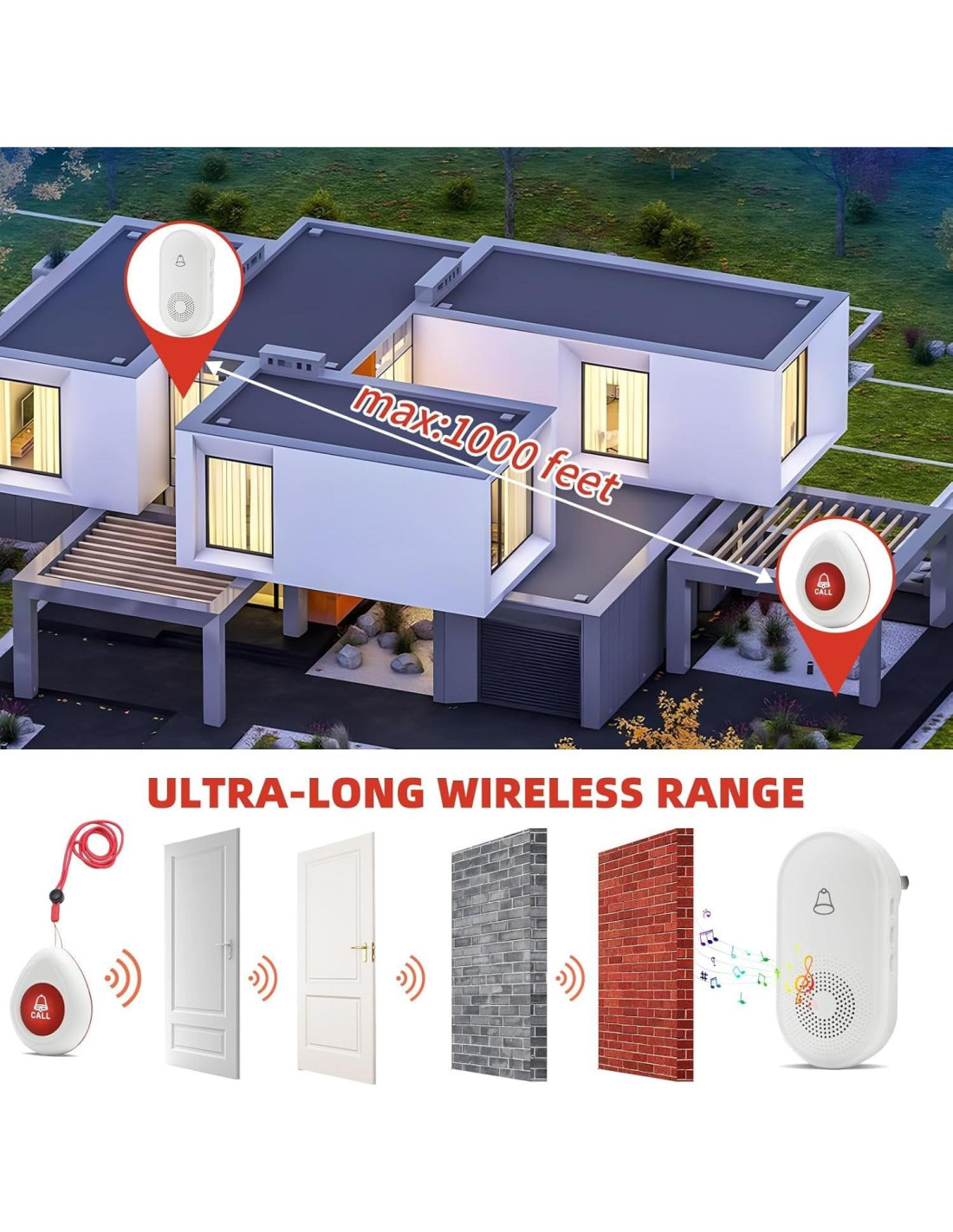 - Fácil de usar y llevar: Listo para usar directamente de la caja sin emparejamiento. El receptor se puede mover con los cuidadores a la habitación, cocina, baño o jardín. El botón de llamada se puede colgar convenientemente alrededor del cuello con una cuerda colgante, o instalar en la pared con cinta adhesiva de doble cara o tornillos (el paquete incluye cuerda colgante, cinta adhesiva de doble cara y tornillos). Soporta un rango de operación de 1000 pies (304.8 metros) en áreas abiertas para asegurarte de que no te pierdas ninguna señal de socorro.