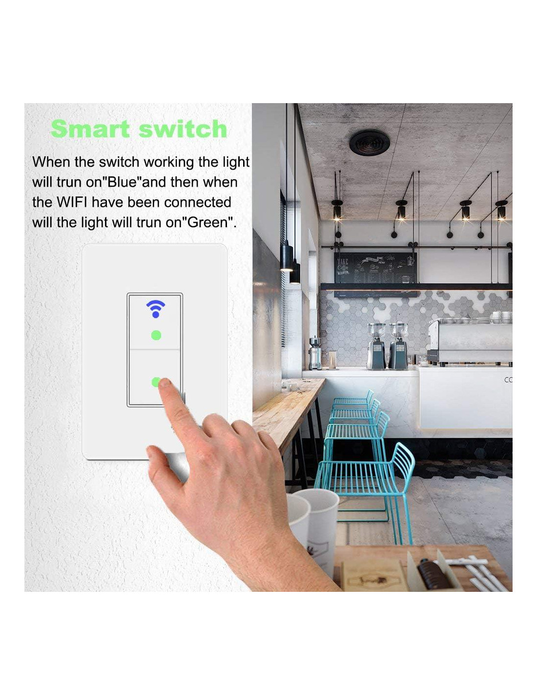 Descripción del Producto El Interruptor de Luz Inteligente Wi-Fi utiliza su red Wi-Fi doméstica existente para proporcionar control inalámbrico de sus luces desde cualquier lugar, no se requiere hub, puede reemplazar fácilmente los interruptores tradicionales directamente, luego puede comenzar a controlar sus luces desde su teléfono móvil a través de la APP 'Smart Life' (iOS o Android). El interruptor de luz inteligente también es un interruptor normal, simplemente el interruptor para encender o apagar sus luces. Aplicaciones -Controlar Luces desde Cualquier Lugar. -Establecer Horarios para las Luces. -Navegación Nocturna LED. Características -Tipo: Interruptor de Luz de Pared Inteligente -Material: Polímero retardante de llama PC -Voltaje de Funcionamiento: AC 110V-240V/50Hz~60Hz. -Potencia Máxima: 1100W/gang (carga resistiva) -Carga capacitiva: 400W/gang -Corriente de trabajo: Máx 10A -Humedad de trabajo: <80% -Protocolo de radio: WiFi 2.4GHz -Consumo de energía en espera: menos de 0.1mA -Entorno de funcionamiento: -20~45C, (-4~113 grados F) -Vida útil: más de 100,000 veces -Dimensiones del Interruptor: 5.04*3.31*1.18 pulgadas (12.8*8.4*3 cm) El Paquete Incluye -1x Interruptor de Luz de Pared Inteligente -1x Manual del Usuario -2x Tornillo