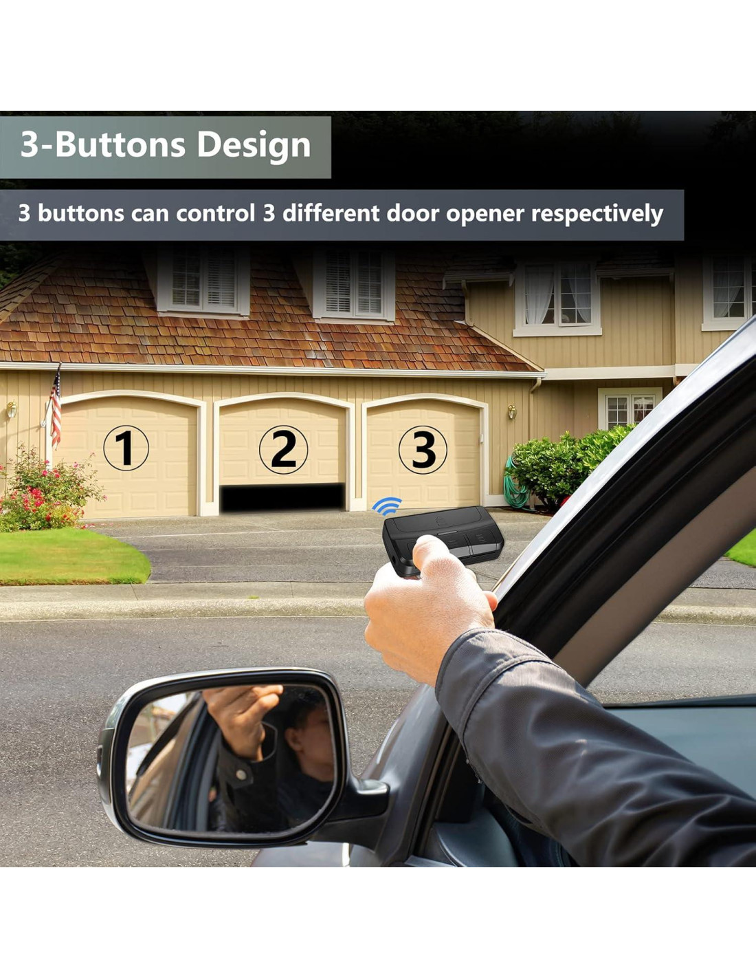 - 3 Botones El control remoto para abridor de puerta de garaje tiene 3 botones que pueden controlar 3 abridores de puerta de garaje diferentes respectivamente. Ahorra la molestia de llevar múltiples controles remotos contigo.