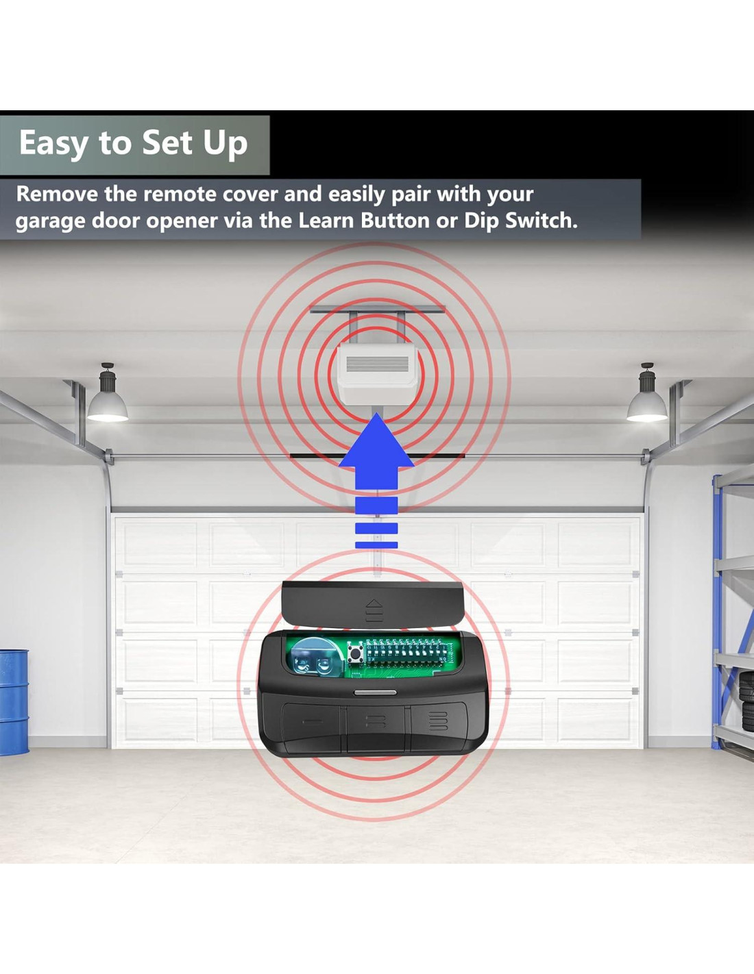 - Fácil de Programar Los pasos del manual del usuario son simples y claros, puedes emparejar el control remoto a través del botón de aprendizaje o Interruptor Dip de tu abridor de puerta en unos minutos.