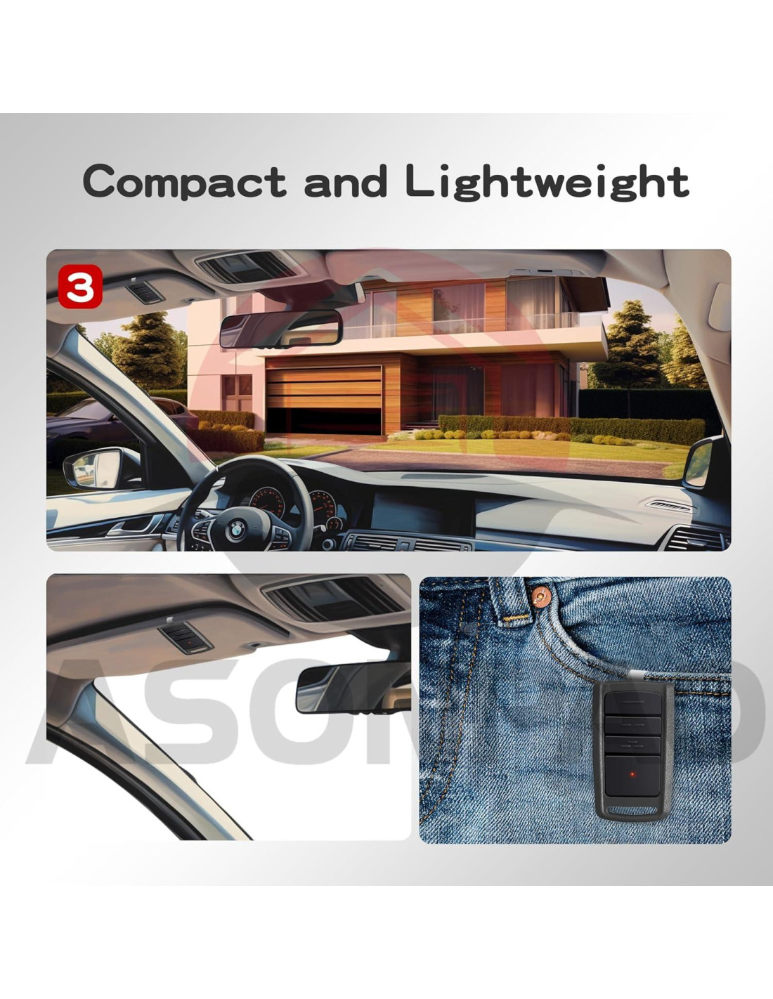 - **Diseño Amigable con el Usuario y Rango Extendida**: Disfrute de un rango de control de 50 metros y emparejamiento sin esfuerzo con el motor de su puerta de garaje. El diseño compacto se adhiere fácilmente al parasol de su automóvil para un acceso rápido y conveniente.