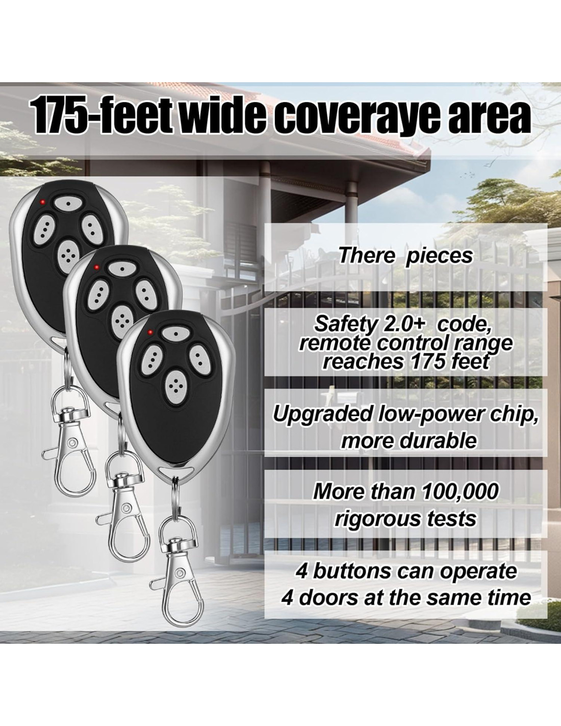 - Contenido del Paquete: incluye 3 transmisores remotos de abridor de puerta compatibles con LM123, 3 llaveros y 3 manuales; La frecuencia del control remoto es 433.92MHZ, con 4 canales independientes; Materiales de alta calidad y tecnología de bajo consumo, duraderos y que satisfacen completamente sus necesidades.