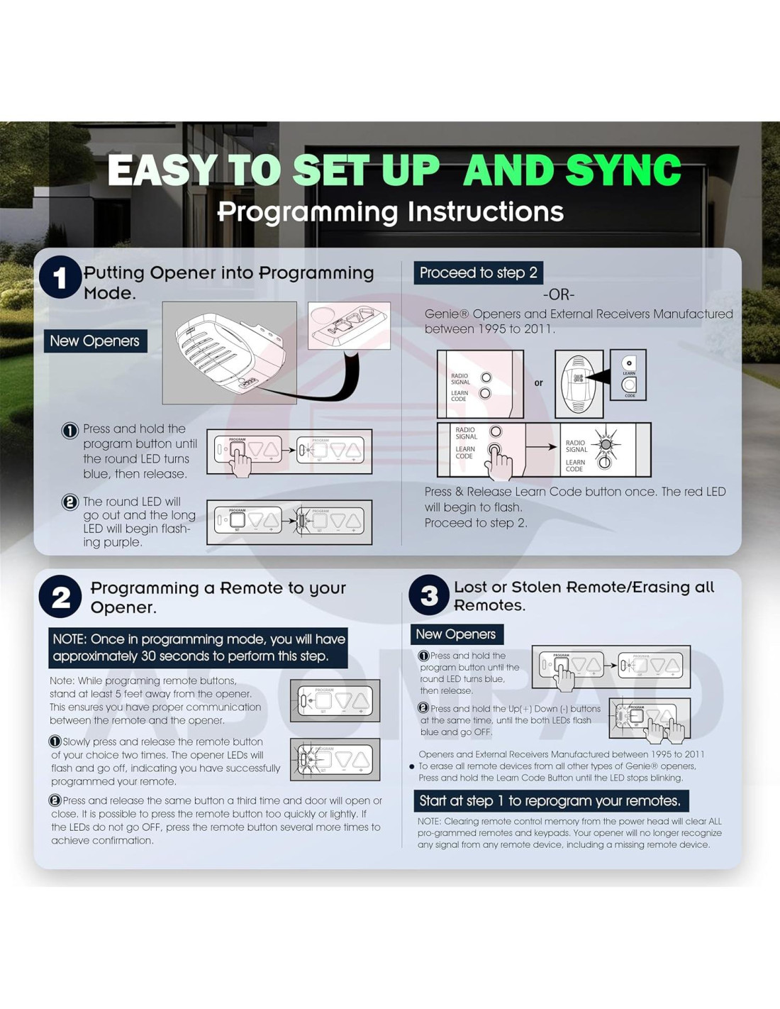 - **Amplia Compatibilidad**: Compatible con todos los abridores de puertas de garaje Genie desde 1997 hasta la actualidad. (NO funciona para controles remotos con interruptor de palanca!)