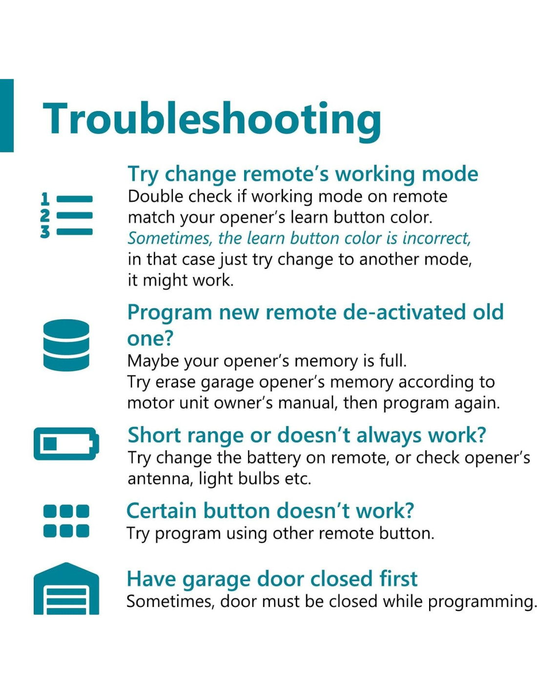 - Compatible con modelos de abridores 1345, 1355, 1356, 3220, 3240, 3255, 3265, 3266, 3267, 3270, 3280, 3500, 3585, 3595, 3800, 3850, 8165, 8365, 8366, 8367, 8500, 8550W etc (NO funciona con ningún sistema de interruptores DIP, NO funciona con Genie / Overhead Door / Linear)