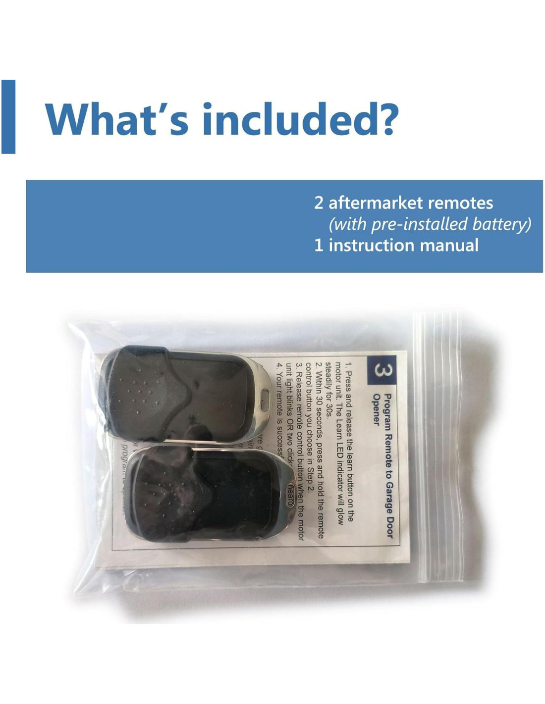 Antes de comprar, por favor verifica que tu abridor de puerta de garaje NO sea compatible con Genie intellicode o abridores de Overhead Door, NO funciona para ningún sistema de interruptores DIP. NO funciona para el entrenamiento de homelink en vehículos. Este control remoto de reemplazo de mercado secundario SOLO funciona con abridores de puerta de garaje de marca LiftMaster / Chamberlain / Sears Craftsman (colgado en tu garaje) con botón de aprendizaje morado, rojo/naranja, amarillo o verde fabricados desde 1993 hasta la actualidad que cuentan con tecnología Security+ 315 MHz / 390 MHz o Security+ 2.0 MyQ o Billion Code. O puedes verificar si el número de modelo de tu control remoto está listado a continuación Security+ 315 MHz (abridores con botón de aprendizaje morado 2005-2014) modelos de controles remotos a continuación LiftMaster: 355LM, 365LM, 370LM, 371LM, 371LMC, 372LM, 372LMC, 373LM, 373LMC, 373P, 373W, 374LM, 374LMC, 376LM, 377LM, 377LMC, 378LM, 398LM, Entrada Sin Llave 65LM Chamberlain: 950D, 950CD, 953D, 953CD, 956D, 956CD, Entrada Sin Llave 940D, 940CD Sears Craftsman: 139.18191, 139.18192, 139.53752, 139.53753, 139.53754, HBW2028 Security+ 390MHz (abridores con botón de aprendizaje rojo o naranja 1997-2005) modelos de controles remotos a continuación LiftMaster: 91LM, 92LM, 94LM, 96LM, 970LM, 971LM, 972LM, 973LM, 973W, 974LM, Entrada Sin Llave 976LM Chamberlain: 950CB, 953CB, 956CB, Entrada Sin Llave 940CB Sears Craftsman: 139.53680, 139.53681, 139.53684, 00953680000, 00953681000, HBW1255 Security+ 2.0 (abridores con botón de aprendizaje amarillo 2011-actualidad) modelos de controles remotos a continuación LiftMaster: 891LM, 893LM, 893MAX Chamberlain: 950ESTD, 953ESTD, G953EV-P2, 953EV-P2 y sistema de accesorio de control de luz MyQ como iluminación interior del hogar y abridor de luz Billion Code (abridores con botón de aprendizaje verde 1993-1997) modelos de controles remotos a continuación LiftMaster: 81LM, 82LM, 83LM, 84LM Chamberlain: 850CB, 853CB, 856CB Sears Craftsman: 139.53879, 139.53859