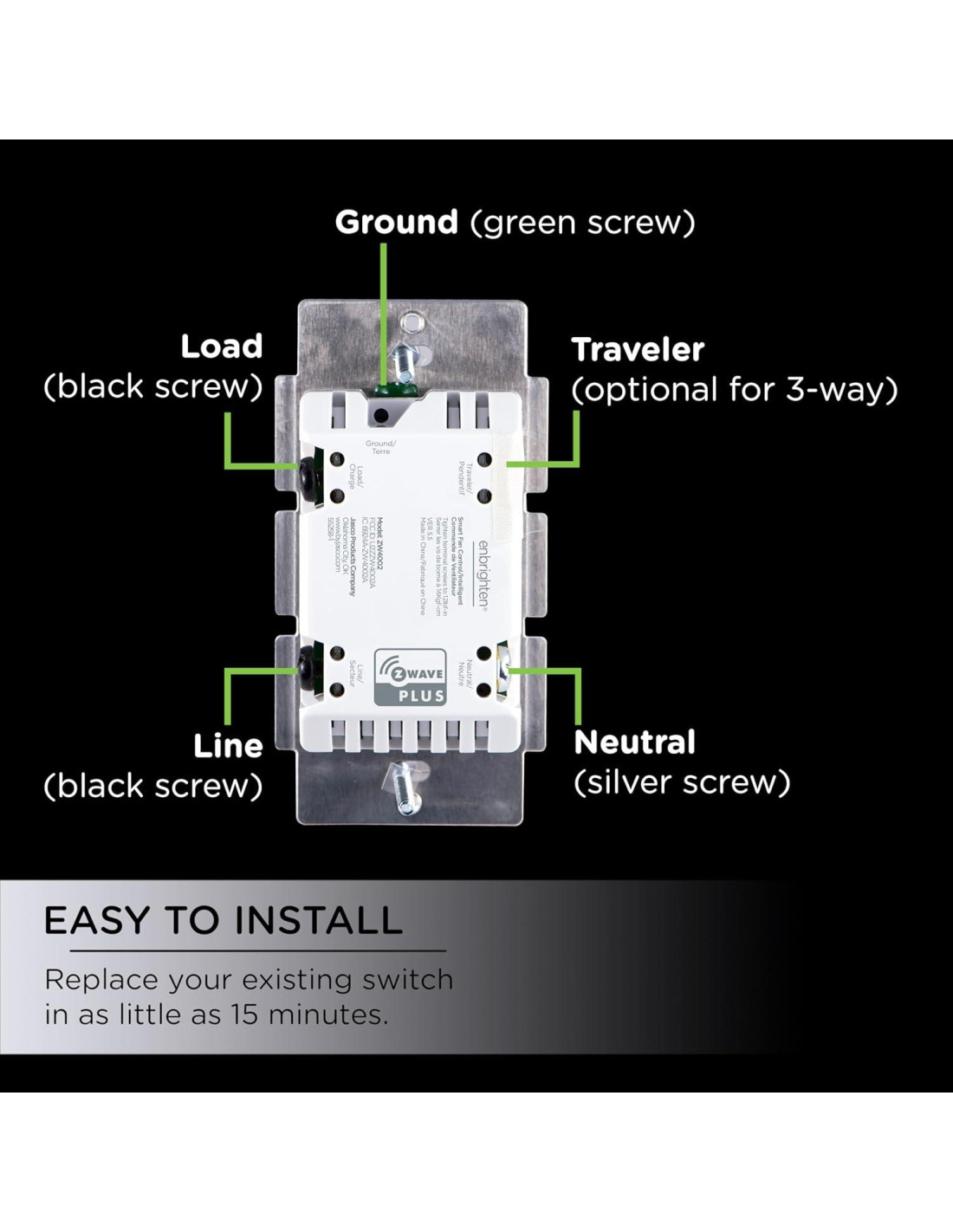 - Dispositivo dedicado - El control inteligente está diseñado específicamente para operar las velocidades de los ventiladores. No se puede usar con iluminación. Sin embargo, las luces en ventiladores equipados con tres cables - típicamente rojo, negro y blanco - pueden ser controladas por separado utilizando un interruptor o regulador Enbrighten Z-Wave adicional.