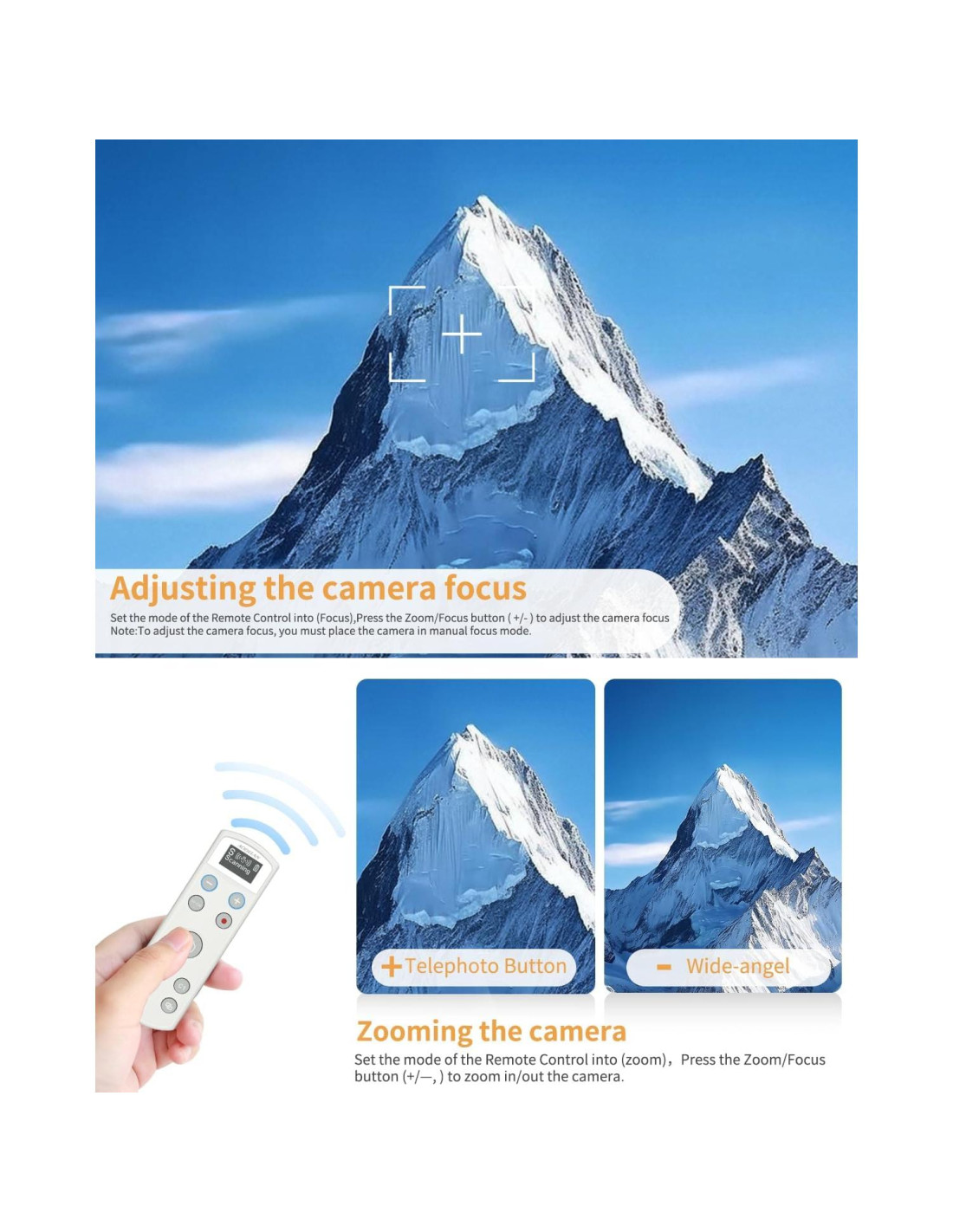 - Control de zoom y enfoque: El control remoto Aodelan para cámaras Sony ajusta el encuadre y el enfoque de forma remota para evitar el movimiento de la cámara. Perfecto para tomas macro y apilamiento de enfoque. (Modo AF: Presionar a medio camino para enfocar)