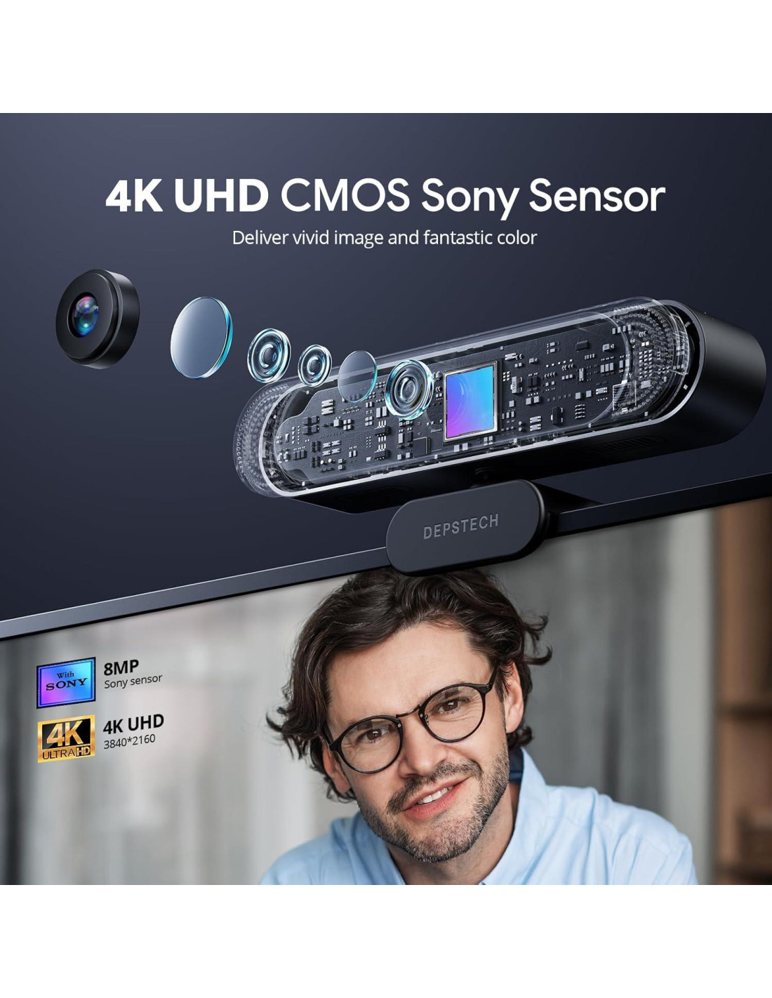 - Resolución 4K y Sensor Sony 1/2.55'' Incorporado, la resolución ultra hd 4K a 30fps en esta cámara web ofrece una imagen nítida sin retrasos, siempre luciendo lo mejor en cada reunión en línea. Actualizado a un sensor CMOS Sony de 1/2.55'', las imágenes son más claras y realistas que antes, capaces de capturar detalles vívidos con un excelente rango dinámico.