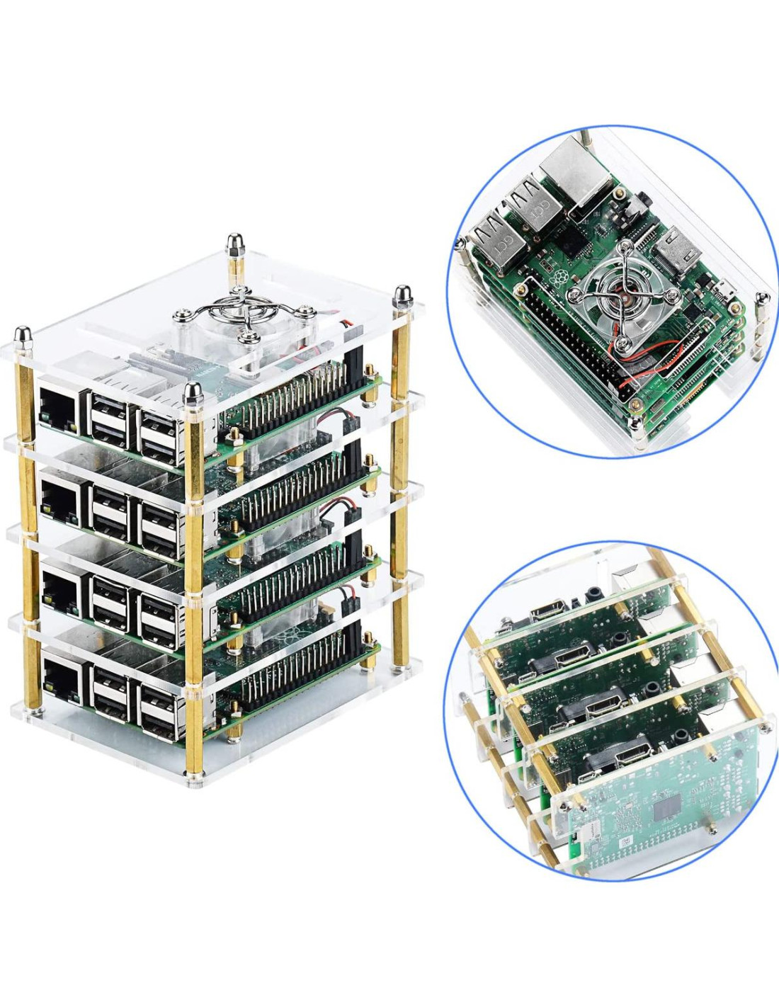 Descripción del producto Compatible con Raspberry Pi 4 Modelo B y Raspberry Pi 3 B+ y Raspberry Pi 3/2 Modelo B El tamaño del estuche de 4 capas Una placa de acrílico: 100mm*72mm*30mm (3.94in*2.83in*1.18in) La separación entre dos placas de acrílico: 25mm (0.98in) Estuche de cuatro capas: 120mm*100mm*72mm (4.72in*3.94in*2.83in) Longitud del cable del ventilador de enfriamiento: 80mm (3.15in) Voltaje y corriente de trabajo: DC 5V / 0.15A Velocidad de rotación: 6000RPM+/-10% Color: Blanco Disipadores de calor --- Grande negro Material: Aluminio Tamaño: 14mm*14mm*6mm (0.55in*0.55in*0.24in) --- Pequeño negro Material: Aluminio Tamaño: 9mm*9mm*5mm (0.35in*0.35in*0.20in) --- Delgado de cobre Tamaño: 12mm*12mm*1mm (0.47in*0.47in*0.04in) Todos tienen cintas térmicas adhesivas en la parte posterior. El paquete incluye 5 x Placas de acrílico 4 x Ventiladores de enfriamiento 12 x Disipadores de calor para Raspberry Pi 3B+/3B/2B 16 x Disipadores de calor para Raspberry Pi 4 Modelo B 1 x Juego de tornillos 1 x Destornillador