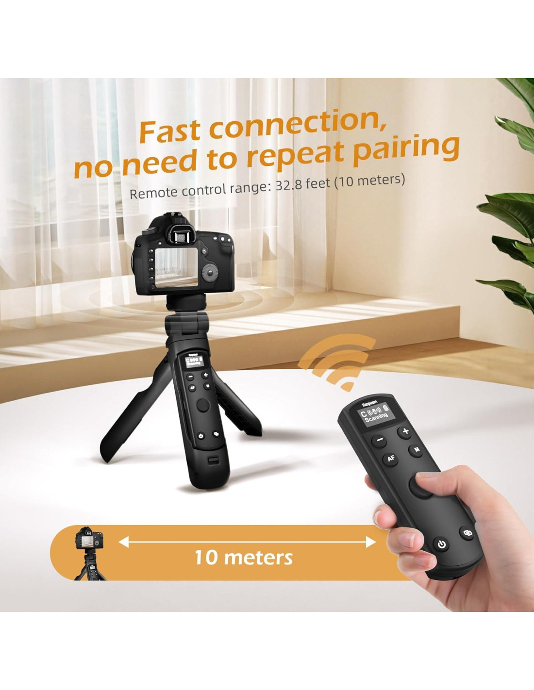 - Este trípode de disparo con control remoto inalámbrico es compatible con una amplia gama de modelos Canon: G7 X Mark III/R50/R8/R5/R10/R6/R100/M50/R5 Mark II/M200/PowerShot V10/PowerShot V1/EOS R/RP/M6 Mark II/M50 Mark II/SL2/SL3/T7i/R6 Mark II/G5 X Mark II/77D/90D/850D. Puedes controlar tu cámara desde 32.8 pies (10 m) de distancia con emparejamiento rápido.