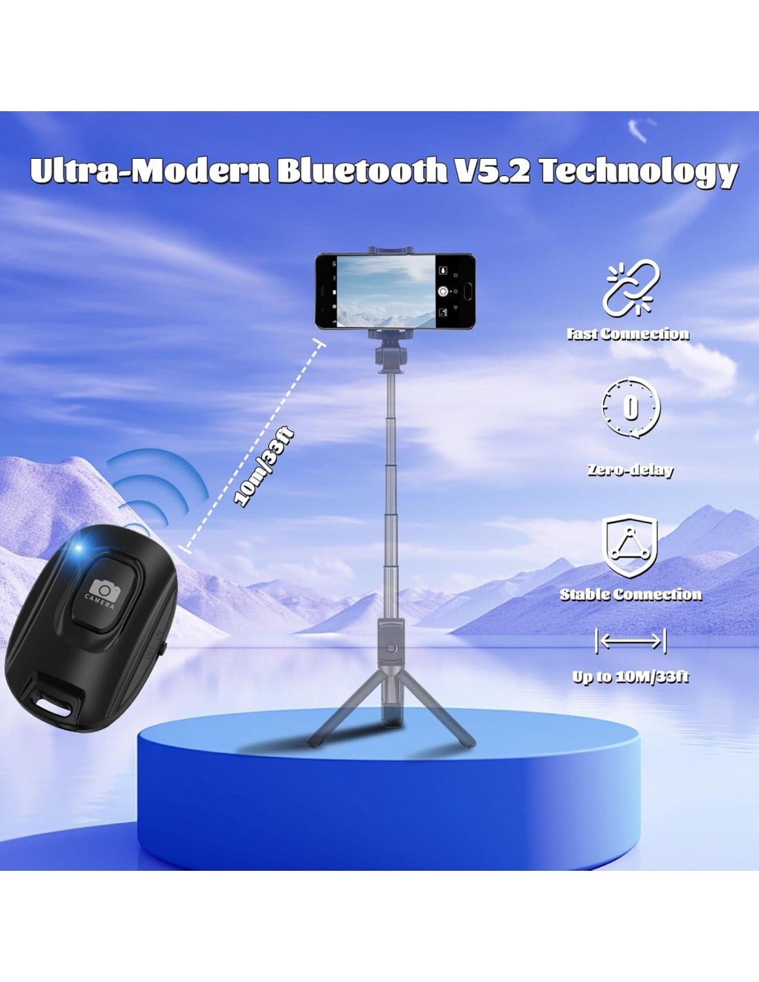 - [Tecnología Bluetooth 5.2 de Última Generación] Experimenta fotografía sin retraso con nuestro control remoto para smartphone. Disfruta de un rango remoto de hasta 10 metros.