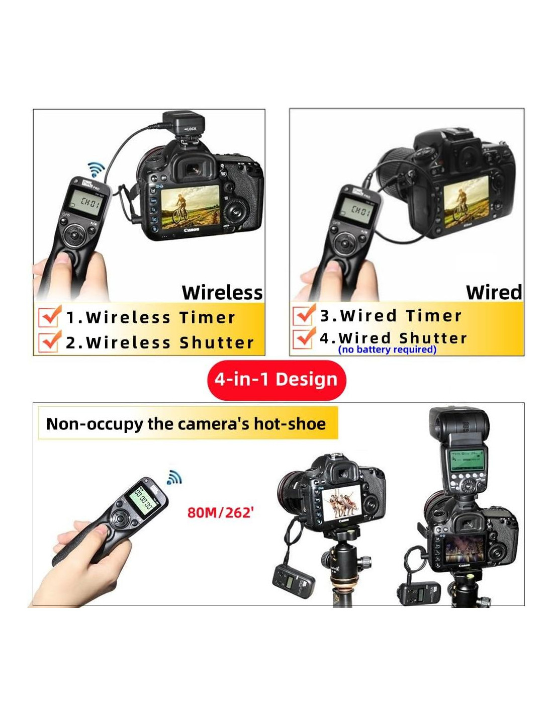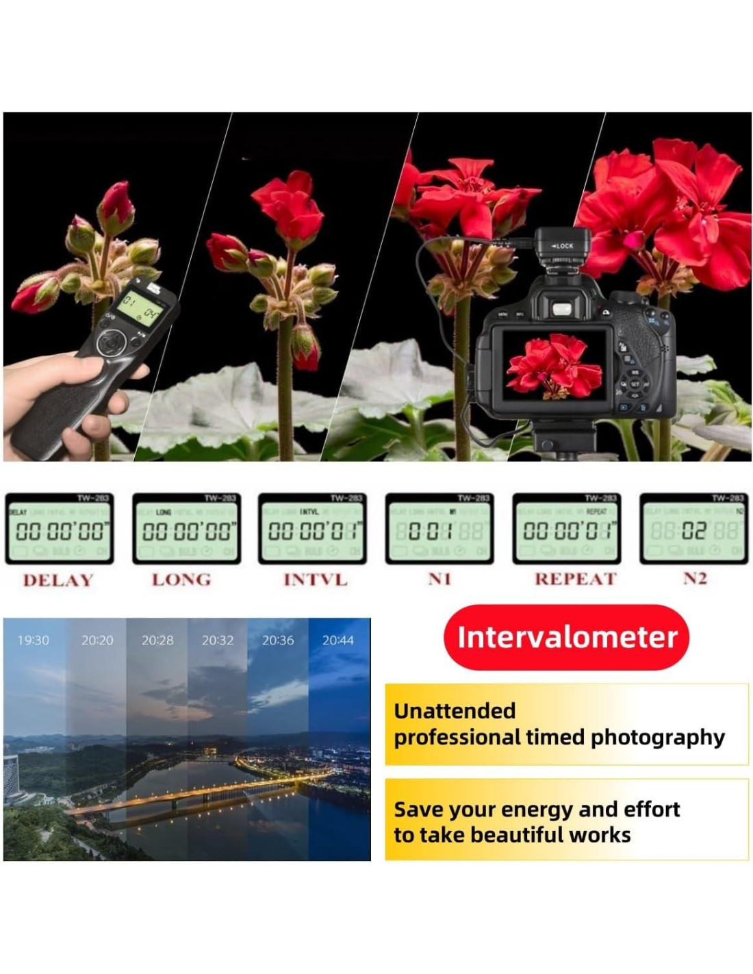 - Al capturar los hermosos momentos del amanecer y el atardecer y la floración y marchitamiento de las flores, no necesitas esperar todo el tiempo. Puedes establecer el temporizador de retraso, el tiempo de exposición, el tiempo de intervalo, el número de disparos, el tiempo de intervalo de repetición y los tiempos de repetición. Las características del control remoto inalámbrico no tienen direccionalidad, distancia remota de 80M+ y una poderosa capacidad anti-interferencia. Con 30 canales para opciones, el control remoto Pixel TW283 puede evitar interferencias causadas por otros dispositivos similares.