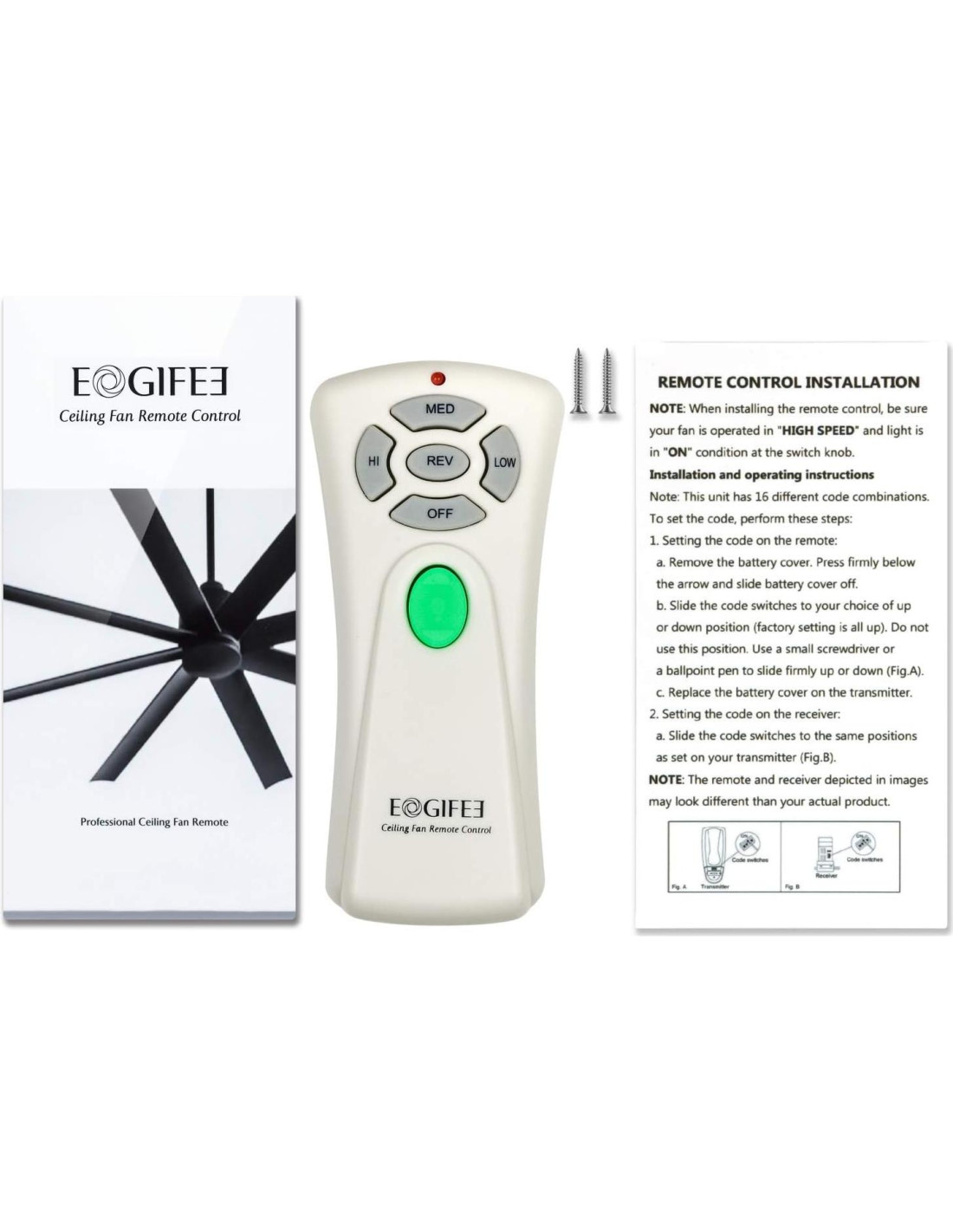 Nuestros productos son productos OEM originales regulares con calidad confiable. POR FAVOR busque Eogifee. NÚMEROS ASOCIADOS: CHQ7078T, UC7080T para Hampton Bay. Si controla múltiples ventiladores de techo en la casa, verifique que la configuración del código PIN sea diferente entre estos, o puede permitir que el transmisor del vecino o el control remoto de su vecindario active este ventilador de techo en sus otras habitaciones. Esto puede causar que el ventilador se encienda extrañamente mientras no está en casa. Este es el control remoto para el ventilador de techo. Deben coincidir con los interruptores en el transmisor dentro del ventilador de techo. Solo recuerde configurar los 4 interruptores DIP dentro del compartimento de la batería (están un poco ocultos detrás de la ranura para la batería misma). Mire dentro del viejo control remoto con la tapa de la batería quitada, hay una serie de interruptores "DIP" (4). Deslice los interruptores en el nuevo control remoto para que coincidan con el mismo patrón que el viejo control remoto. Reemplace la batería en el nuevo control remoto y las cosas deberían funcionar. Hay 16 frecuencias diferentes para los ventiladores Harbor Breeze, por lo que tendría que jugar con las combinaciones. Aquí está la lista de frecuencias: (0 es abajo y 1 es arriba) 0000, 0001, 0010, 0100, 0110, 0101, 0011, 0111, 1111, 1110, 1101, 1011, 1001, 1010, 1100, 1000 Material: ABS Voltaje: 9V Distancia Requerida: 50M (pasar a través de barreras) Regulación de Velocidad: 3 engranajes para cambiar Frecuencia: 303.9MHz (batería de 9V no incluida) 1* Control Remoto 1* Montaje en pared 2* Tornillo, 1* Descripción en papel
